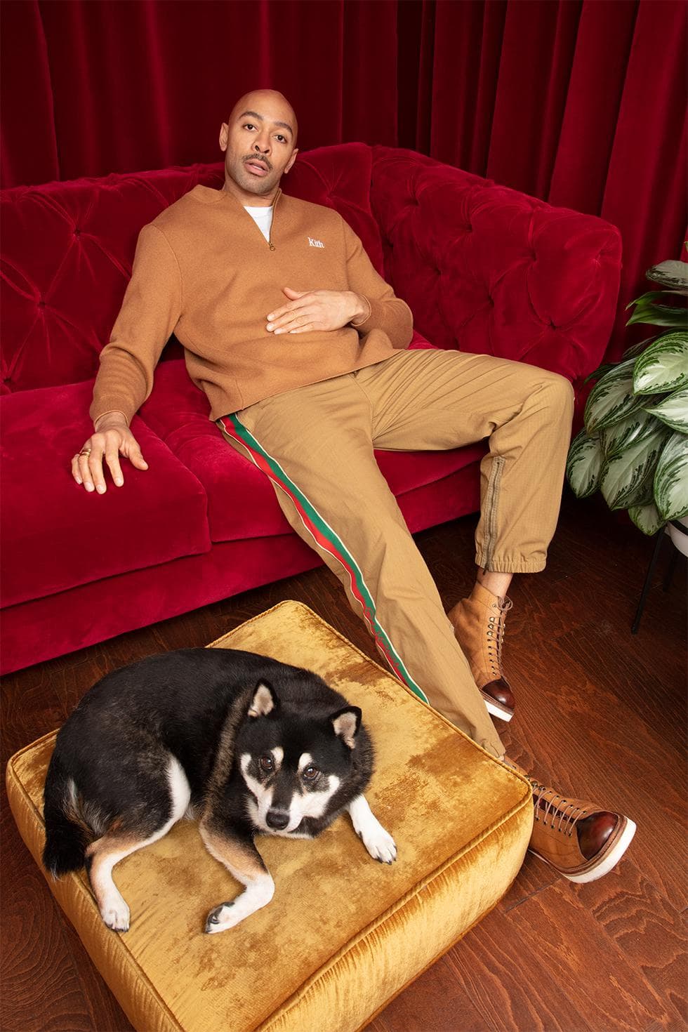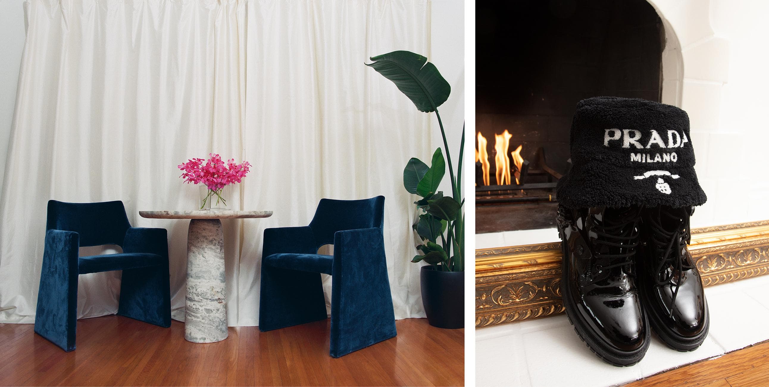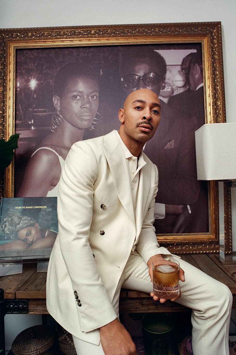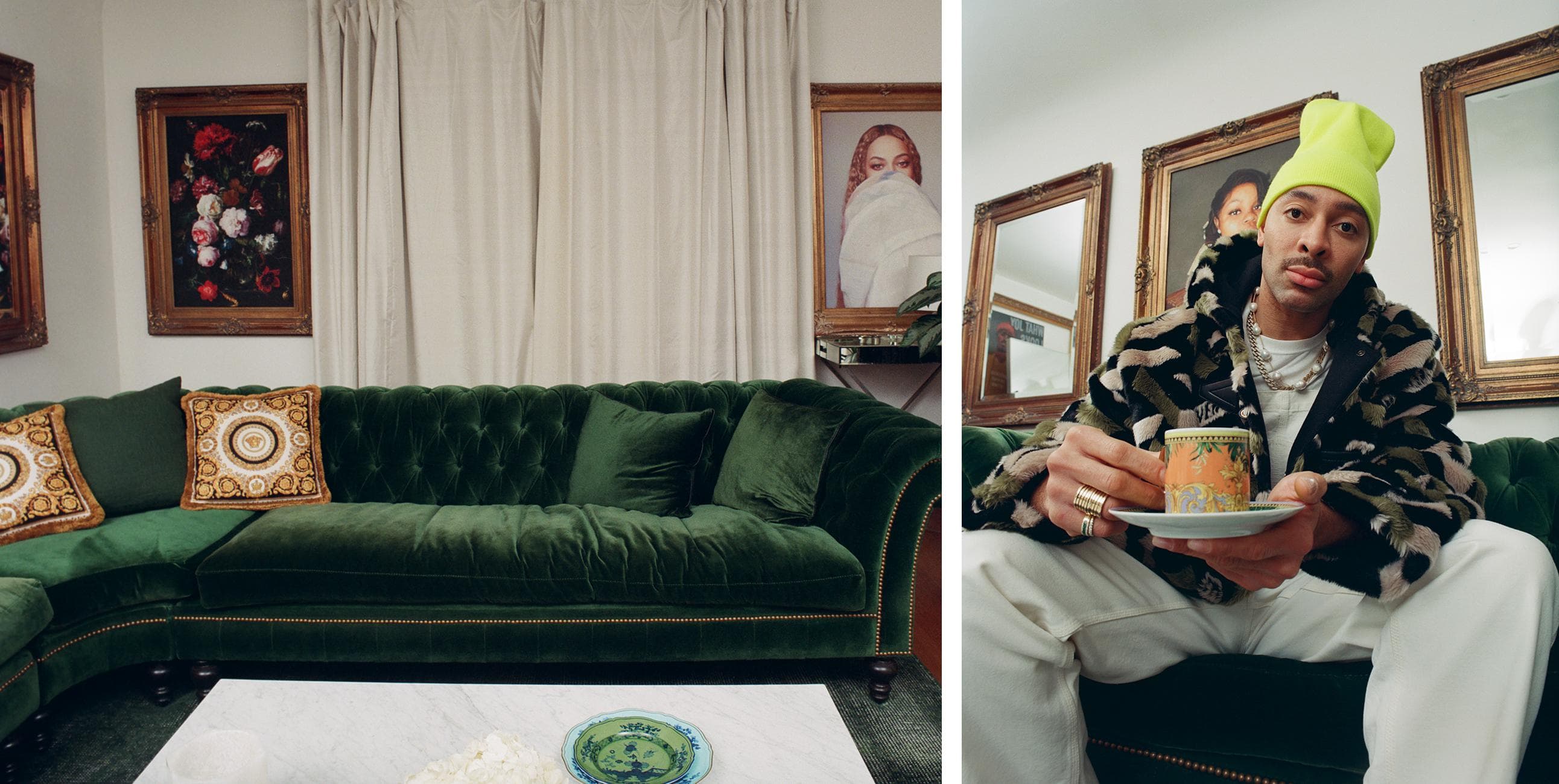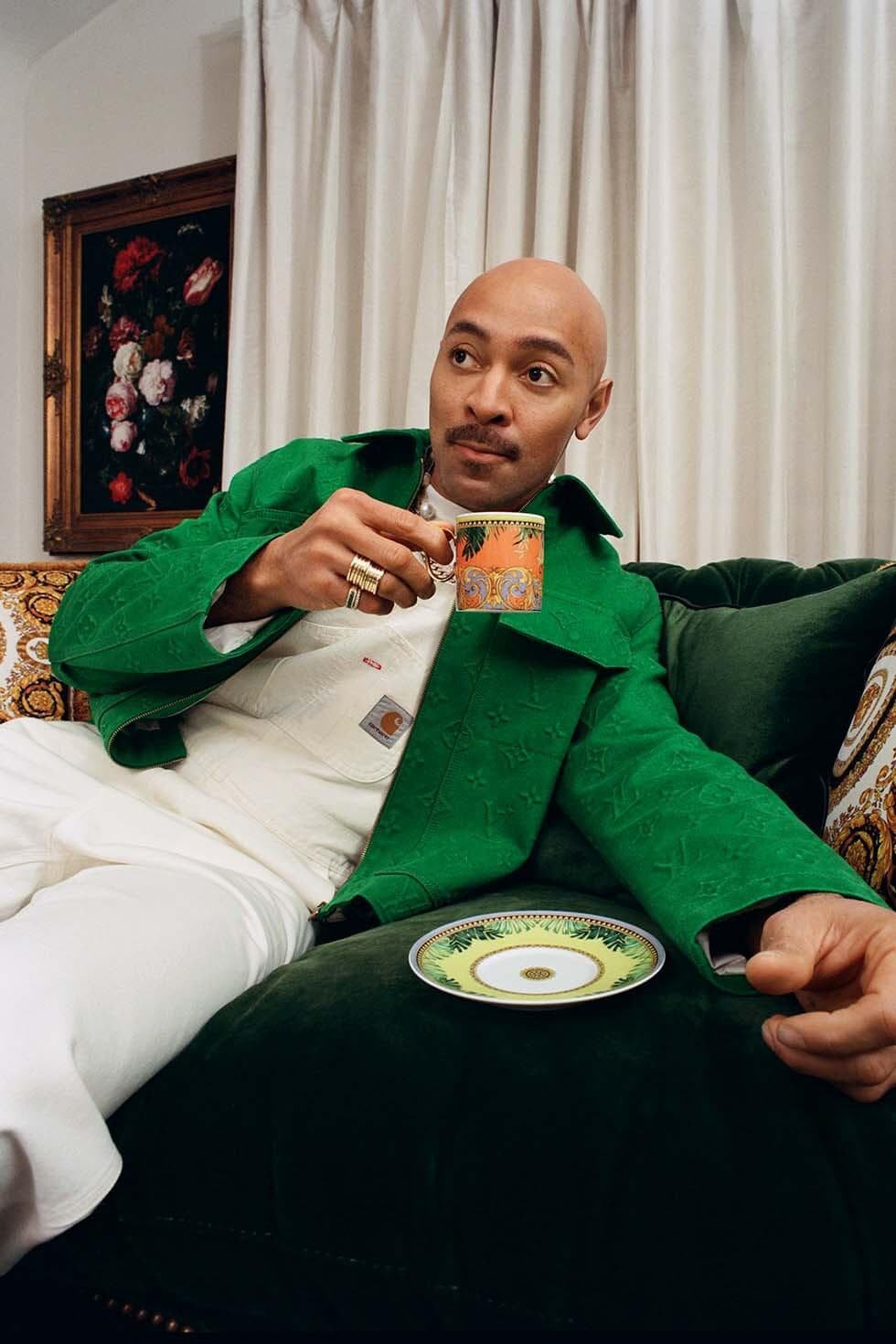 The rest of his home is high-gloss, full-octane glamour. It’s a hybrid of Hollywood’s golden era with a touch of Cinecittà allure; a refreshing departure from the Instagram minimalist homes full of white boucle chairs and ’80s-inspired black granite coffee tables. There are low-lit sconces, gilded frames that line the walls, and lush velvet everywhere. Music from Billie Holiday and Ella Fitzgerald fill a room where a photo of Miles Davis and Cicely Tyson hangs on the wall. There are tea sets from Ginori 1735, an Italian company that’s been around since the 18th century.