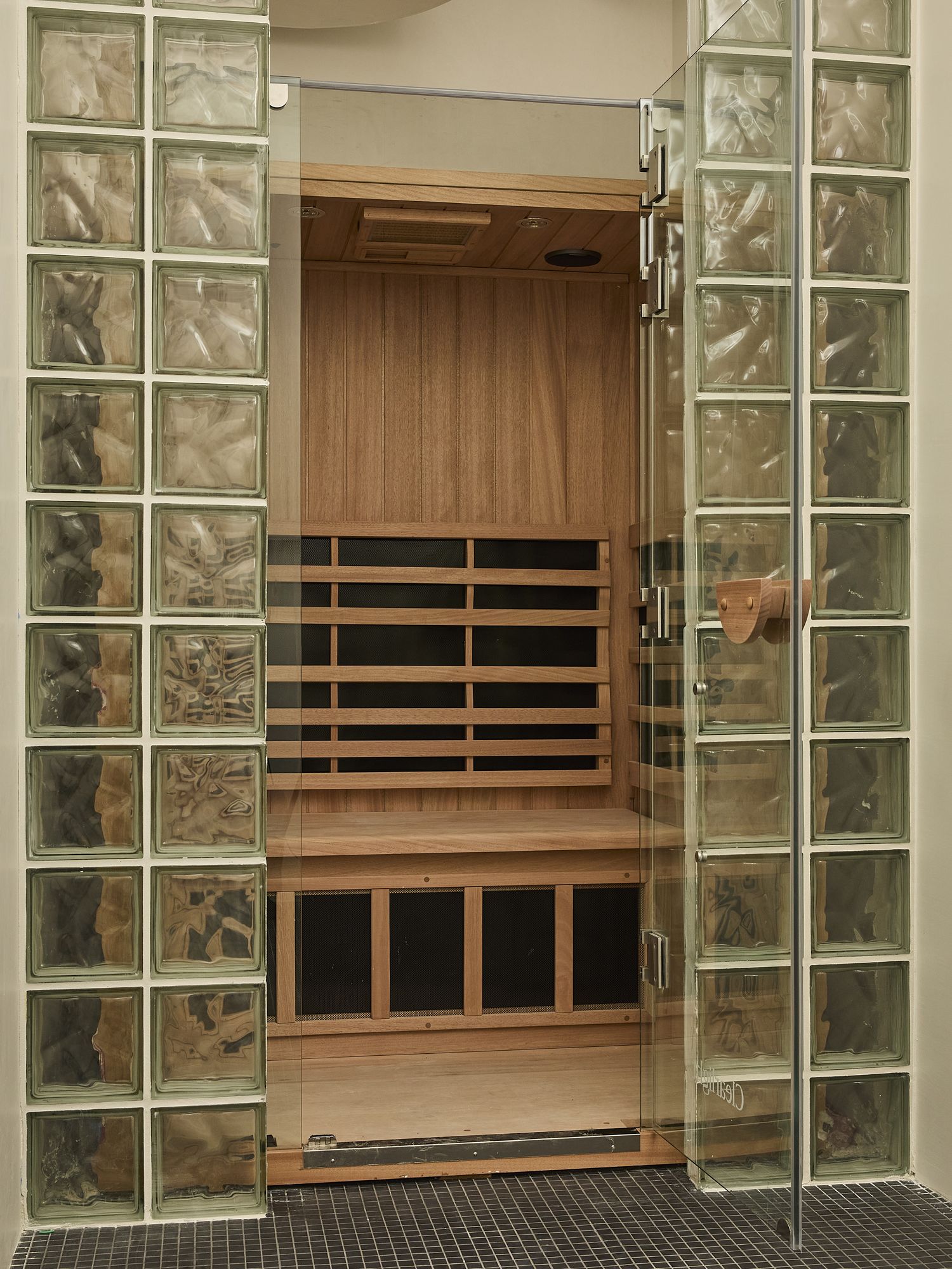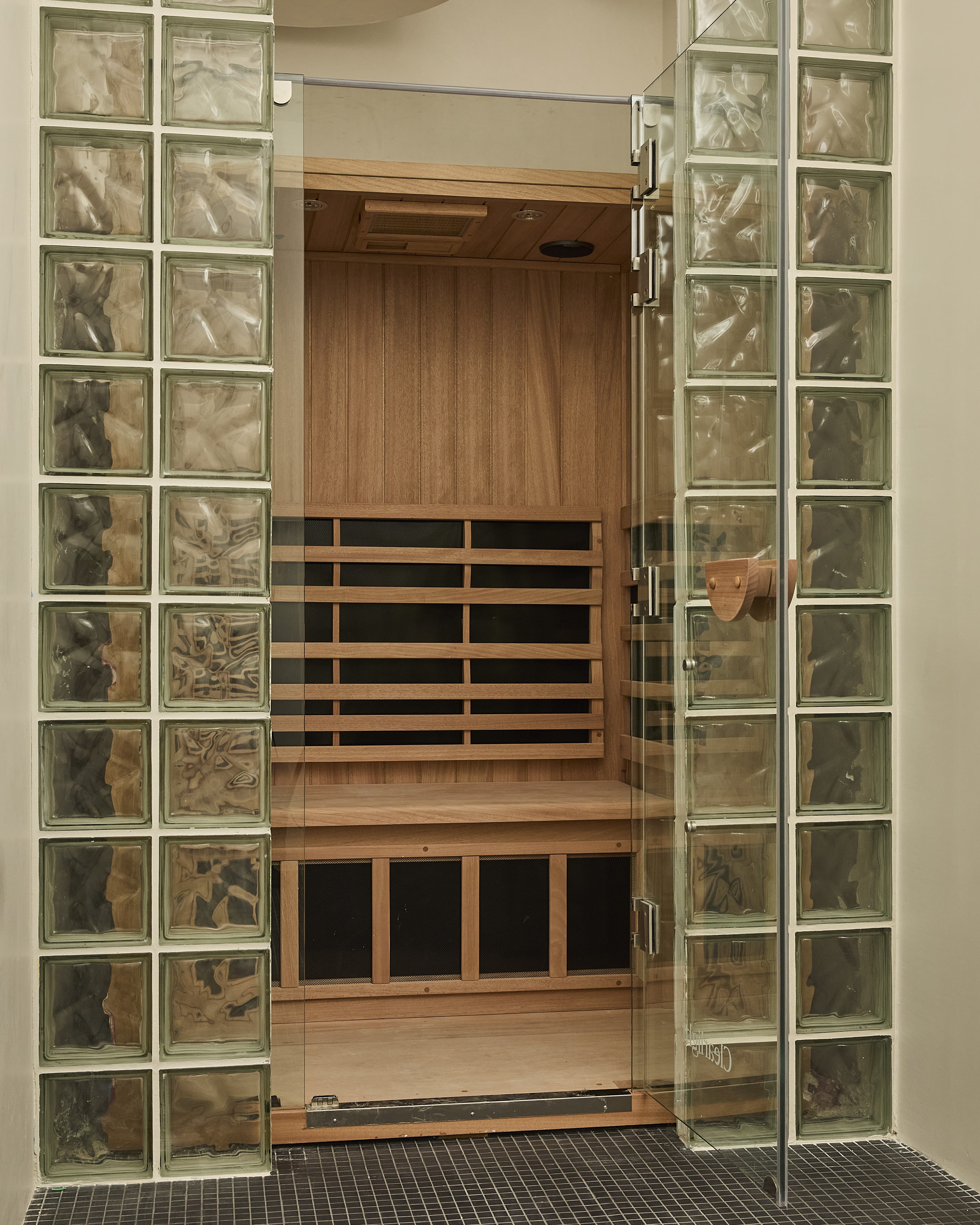 The space is intended to have “a sporty, sexy, ’80s feel” with glass bricks, glossy black accents, brown carpet, and a fully mirrored spa lounge. The Hinoki wood bathroom features backlit shoji screen walls, so the whole room glows. What Krissy didn’t want was something austere. “It’s not Instagram white-wash rooms. We’re funky; we’re playing.”