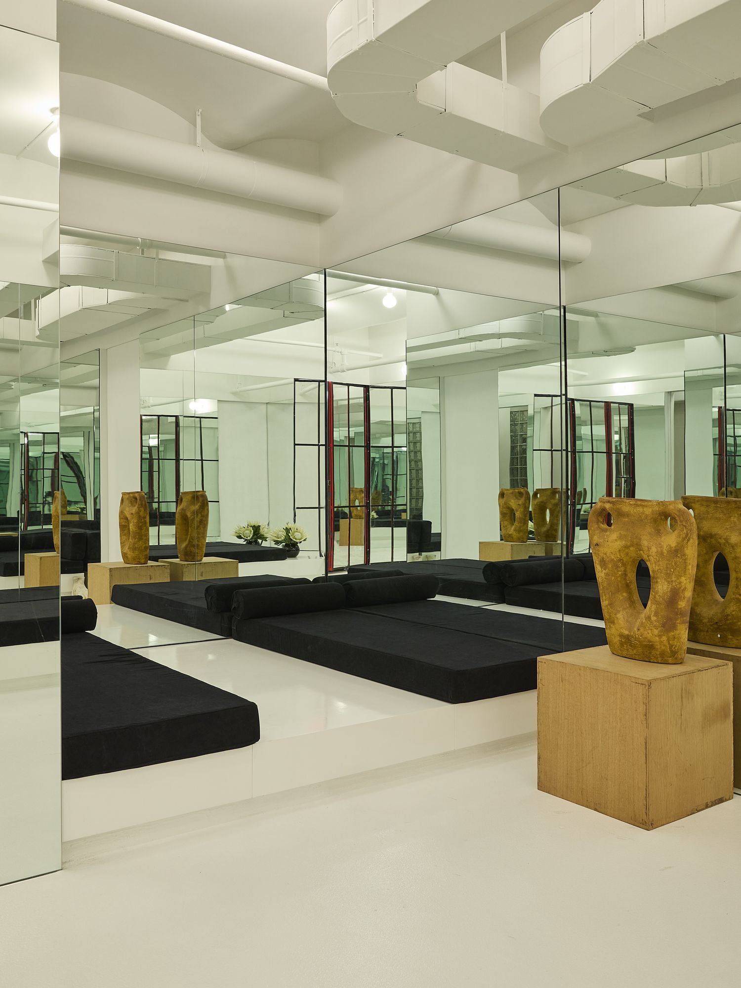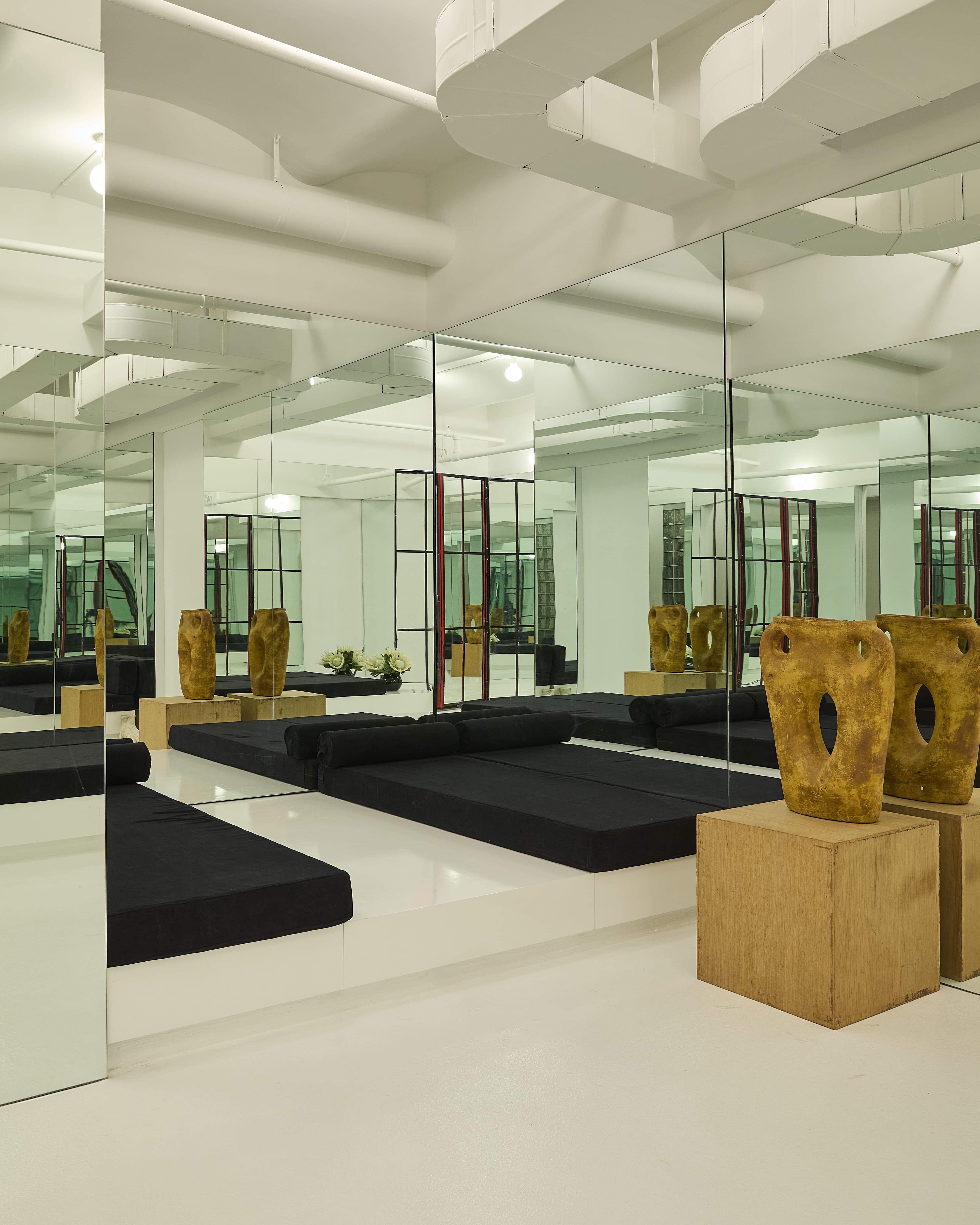 “This was the first time that I really, from tip to tail, got to design the whole thing myself,” says Jones of the new location, which she describes as “an elevated version of Sky Ting.” She worked in tandem with designer Courtney Applebaum, whose work is simple, earthy, and expansive, to create a collaborative space. “I want to give my community a sense of ease, openness, and connection when they're in the studio.”