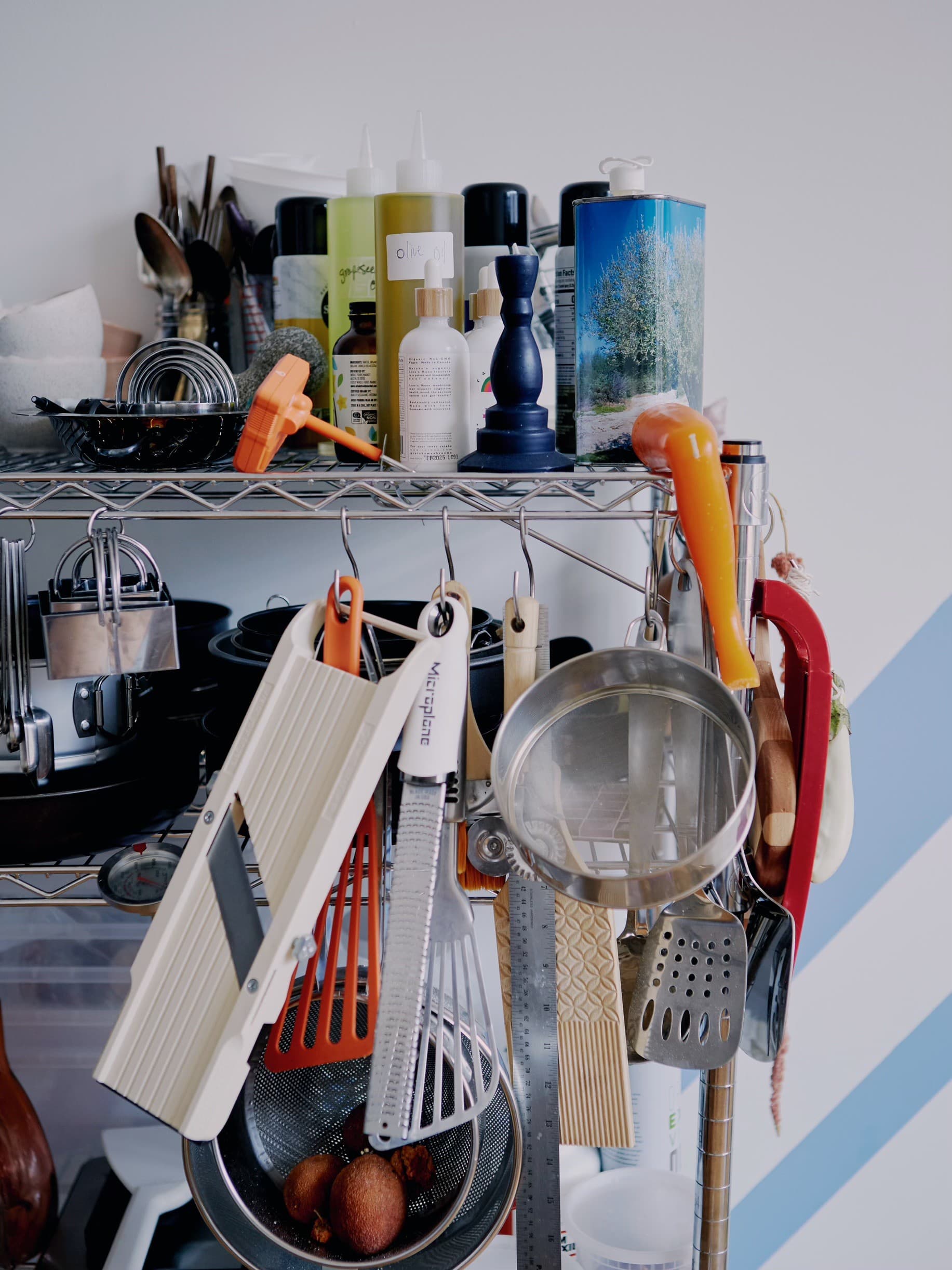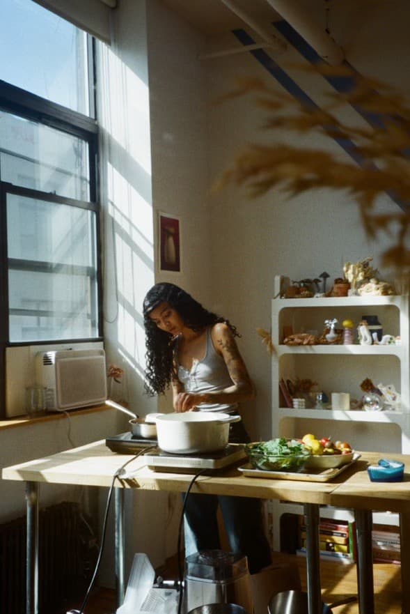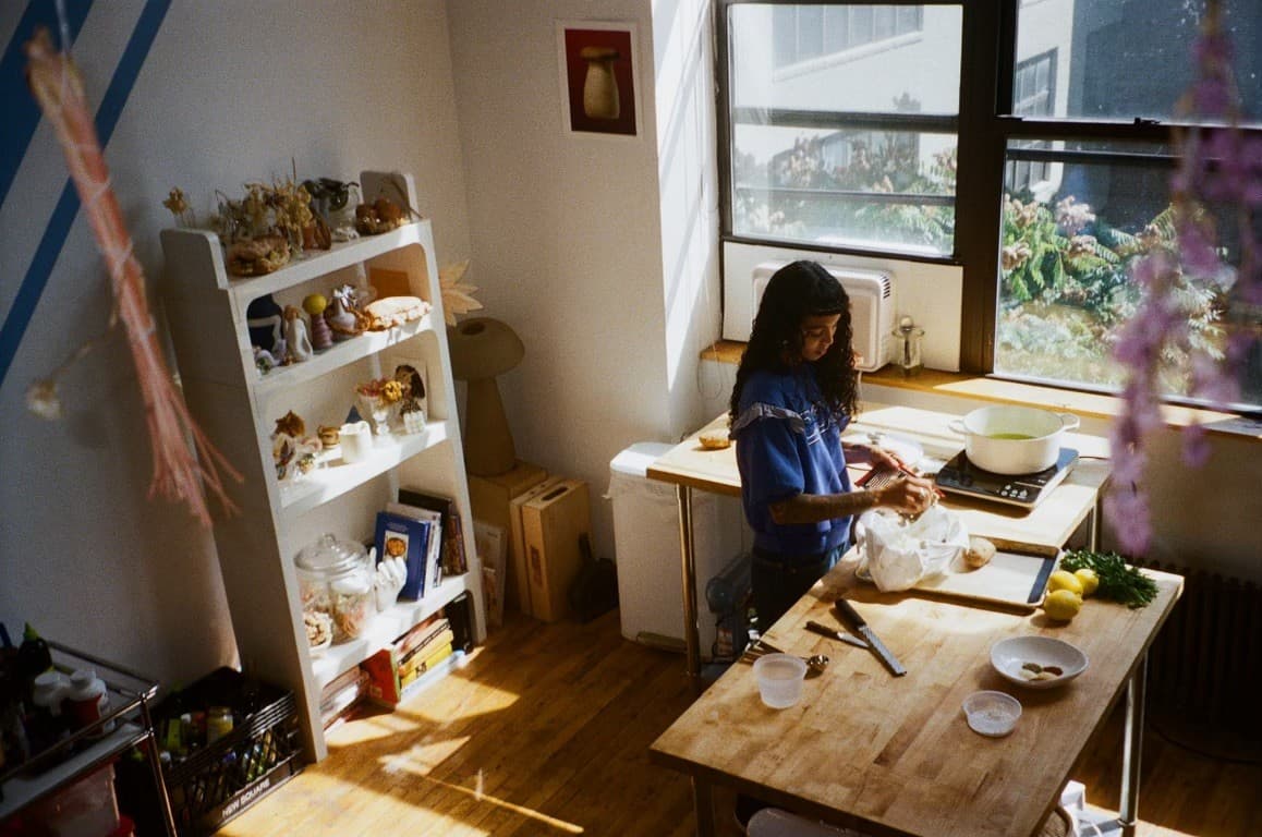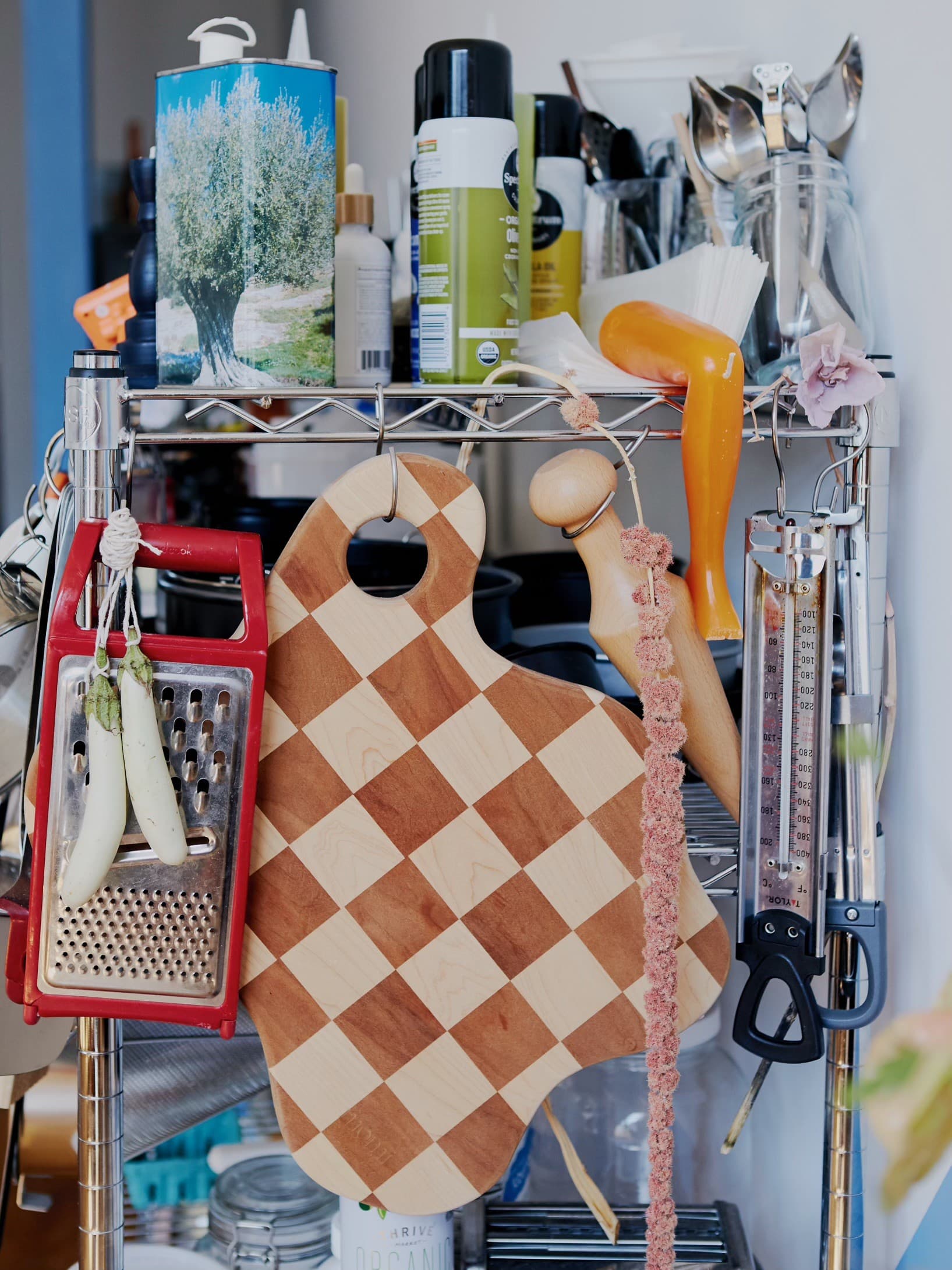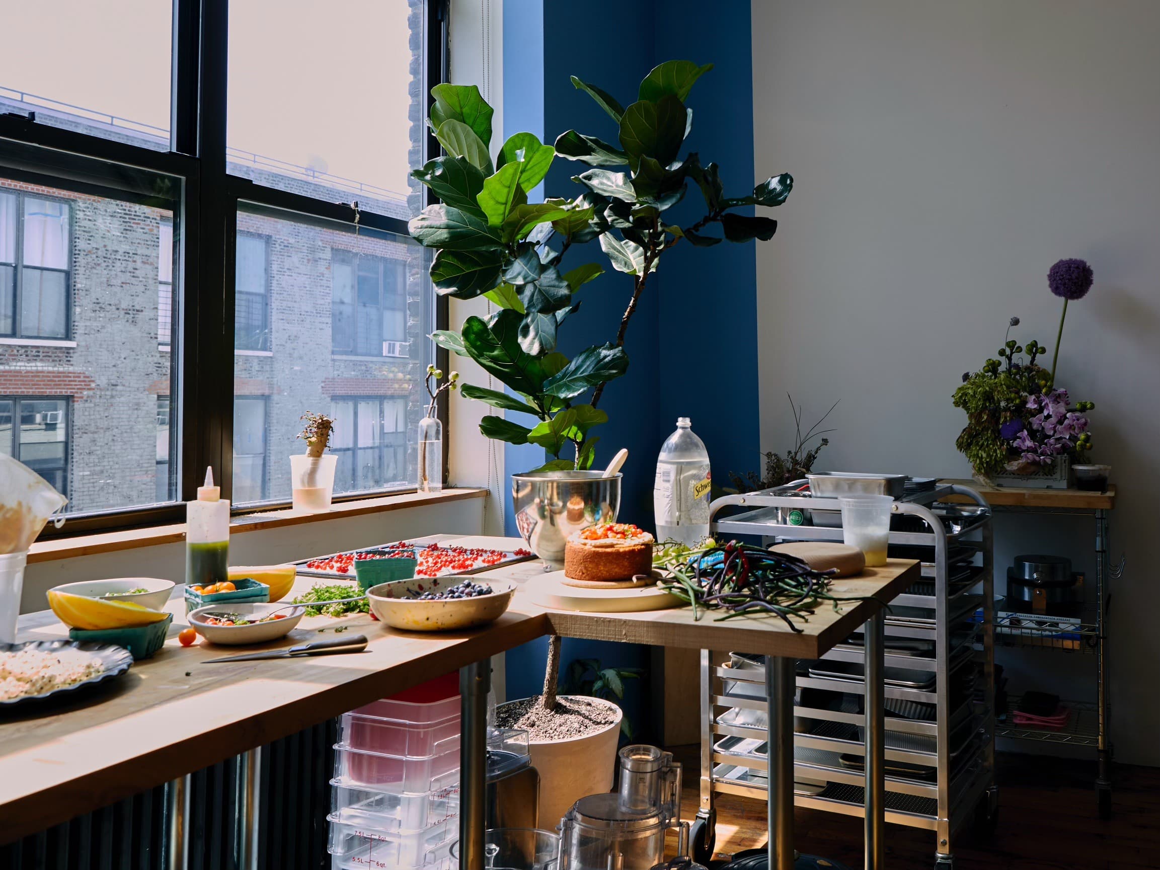 Sophia Roe’s studio kitchen Apartment Miso is not made for sitting. The James Beard Foundation Award-winning chef and host and producer of Counter Space likens her Bushwick loft space to the inside of her brain, a balance between creativity and productivity. It’s full of colors, clothing, and shapes that inspire her, but also stocked with all the equipment and gear she needs to test recipes and create content. She has an abundance of sentimental spoons, dried flowers, and sunlight, but, unlike most of the spaces we have featured in our Nook series, absolutely no cozy areas for resting. It is not a place of stillness; it is a place of action. Ahead, we discuss her unique approach to her work space, her current food muses, and the power of knowing she will always be able to feed her loved ones.