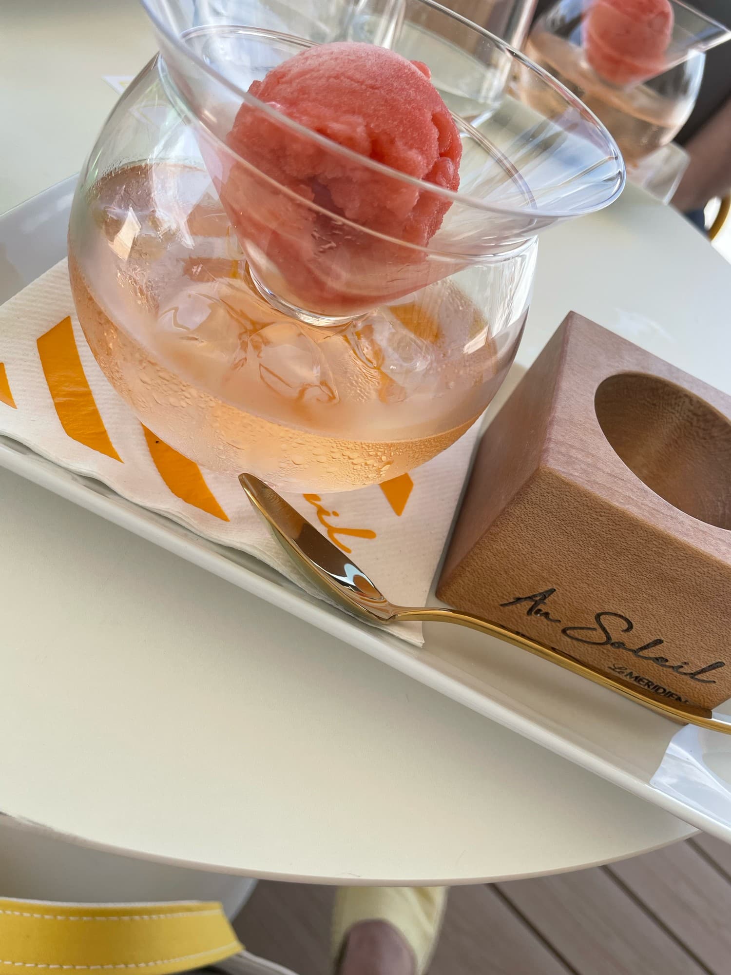 As part of Le Méridien properties Le Scoop program, the brand partnered with New York-based private chef and tastemaker, Meredith Hayden, to craft a bespoke (and absolutely delicious) rosé-infused strawberry sorbet inspired by Whispering Angel. Available for a limited time only through the end of October, the sweet treat is paired with a side of Whispering Angel rosé, making it the perfect bite for a hot day spent under the sun. And, of course, the caviar-style presentation is just as good as the sorbet itself.