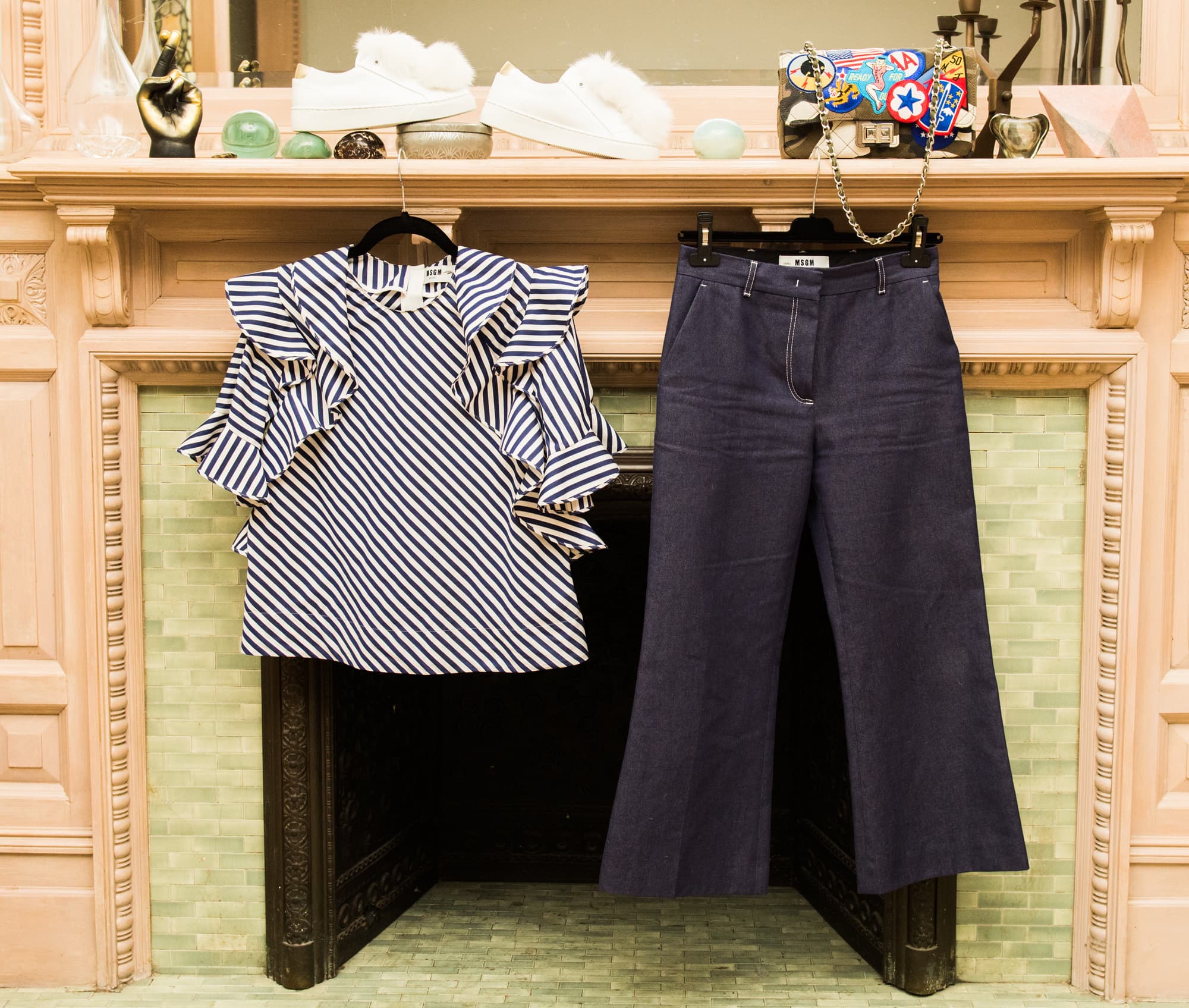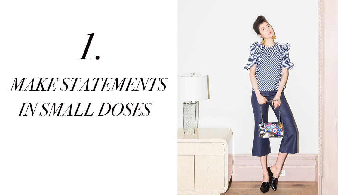 Taking this maxim to heart is the key to looking this good. Look for striped shirting with a twist, like the voluminous, ruffled sleeves on this MSGM blouse. Pair with accessories that, while diminutive, pack serious punch, like these sculptural gold ODLR earrings and patched camo READYMADE bag.