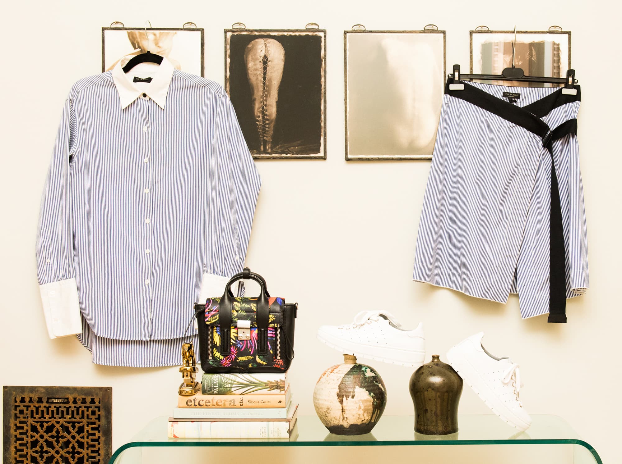 Shirt, Rag & Bone; Skirt, Rag & Bone; Shoes, Rag & Bone; Earrings, Mercedes Salazar
