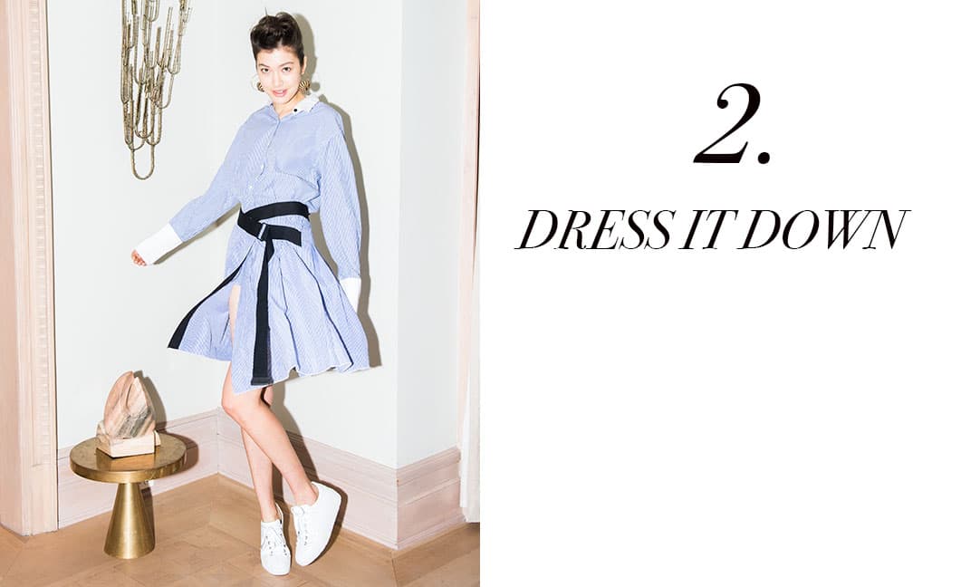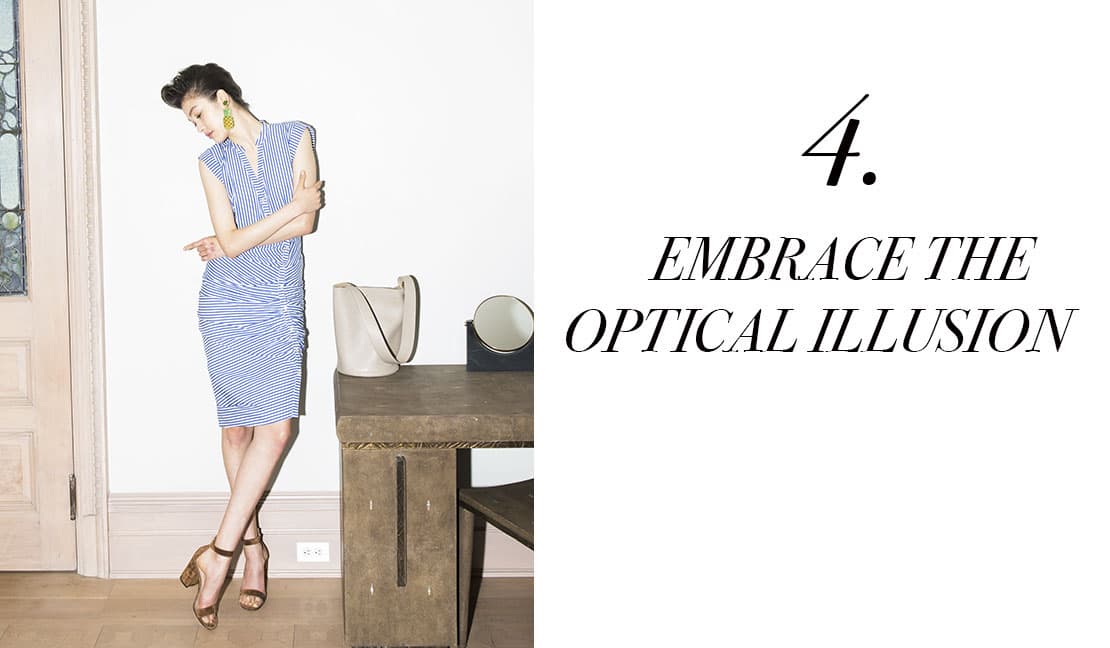 While the notion that horizontal stripes is unflattering has been proven wrong time and time again, the fact remains that the motif can be manipulated to play visual tricks with onlookers. Which is precisely why we love a figure-hugging striped button-down dress that exaggerates everything you’d want exaggerated—Veronica Beard’s, worn here, is the ideal. Add a pair of suede cognac-hued sandals to add to the effect, and throw on oversized pineapple doorknocker earrings just because you can.
