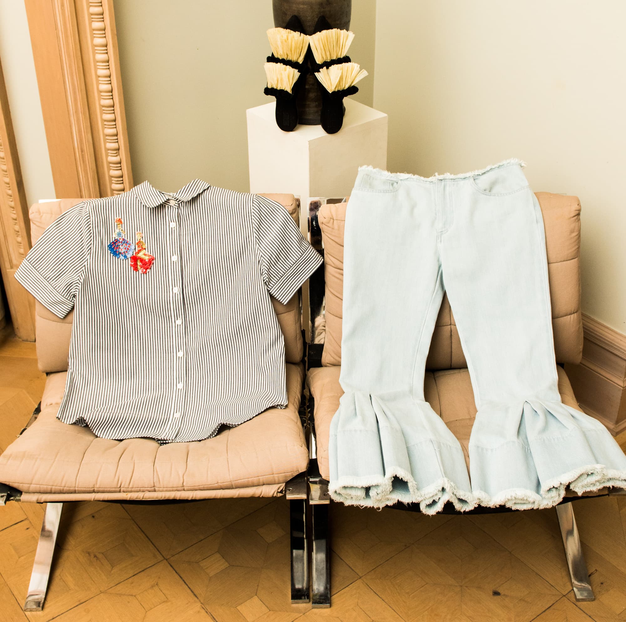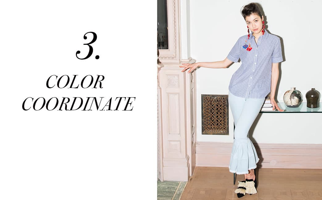 Shirt, Tanya Taylor; Jeans, Marques’Almeida; Shoes, Sanayi; Earrings, Ranjana Khan