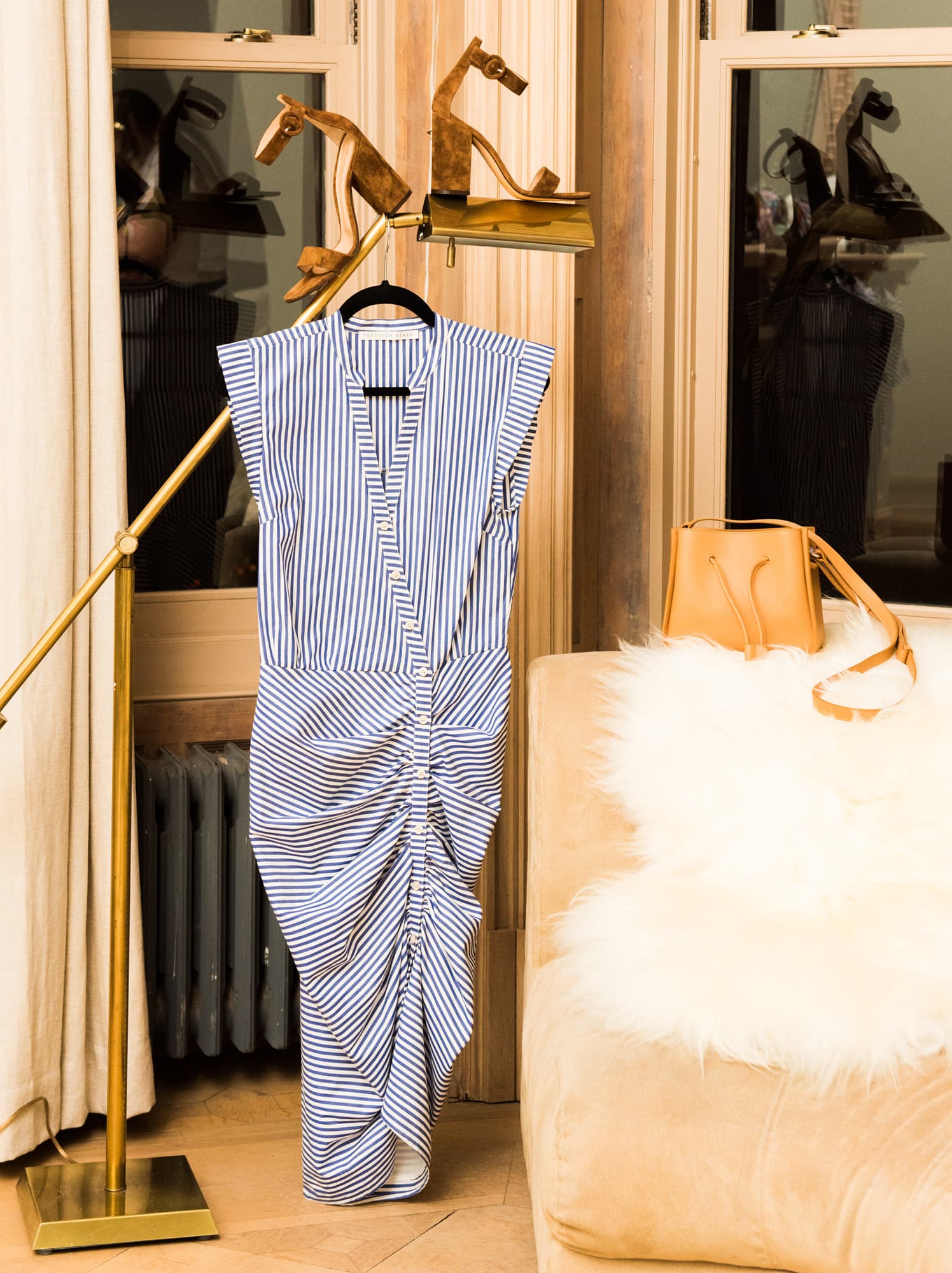 Dress, Veronica Beard; Shoes, Gianvito Rossi; Bag, Derek Lam 10 Crosby; Earrings, Mercedes Salazar