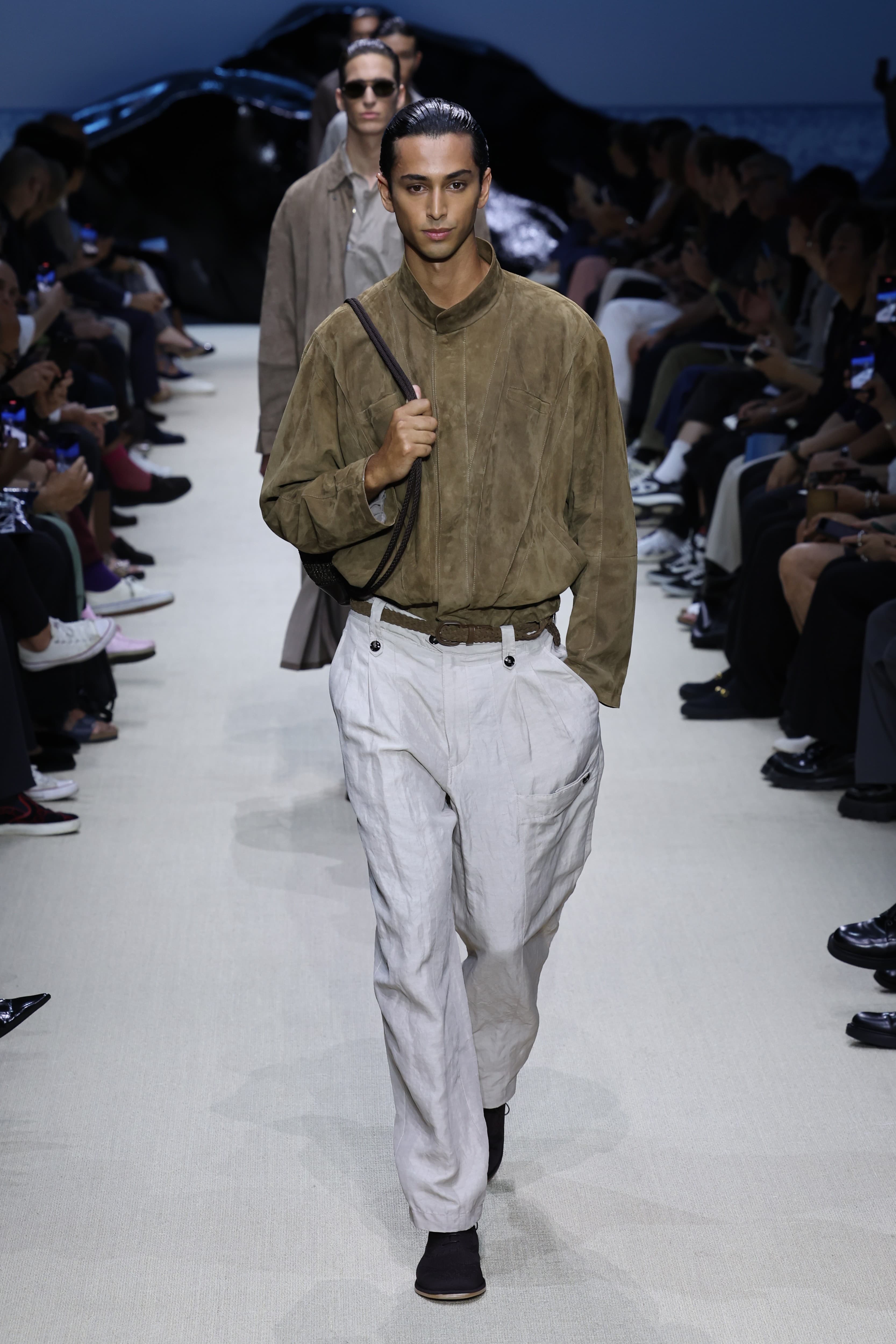 Giorgio Armani Spring 2026 Menswear Getty ImagesA slouchy suede summer bomber paired with a slouchy, relaxed linen pant creates the European silhouette that Mr. Armani is such an expert at.