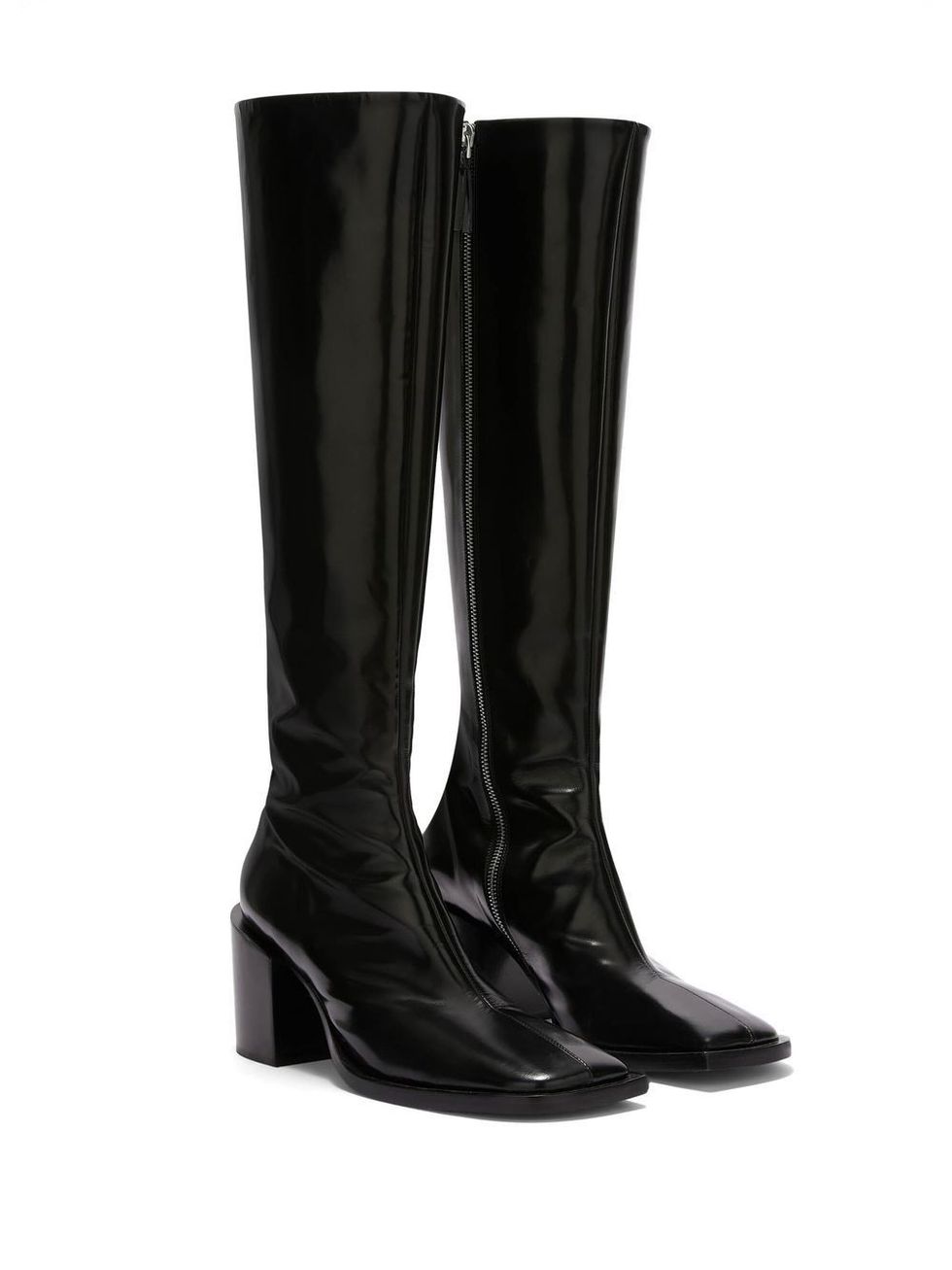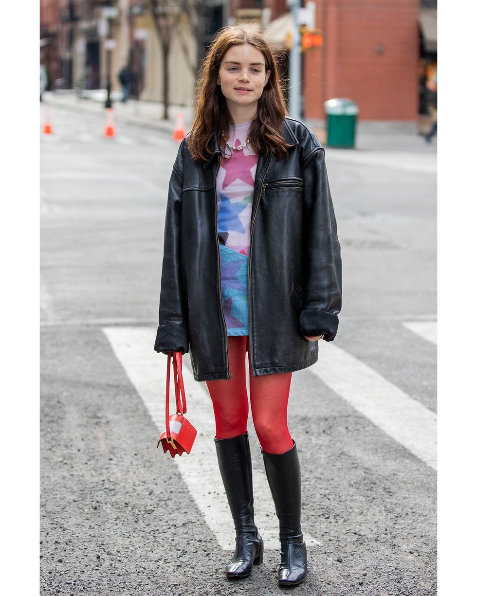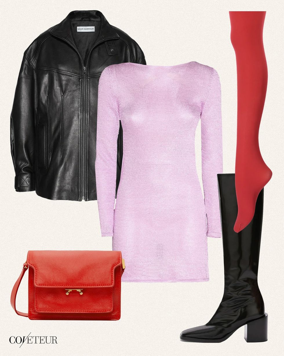 The mini dress and boots combination is as classic as bread and butter, but the oversized jacket and red tights will push this outfit into a full-blown, photo-worthy look for day or night.