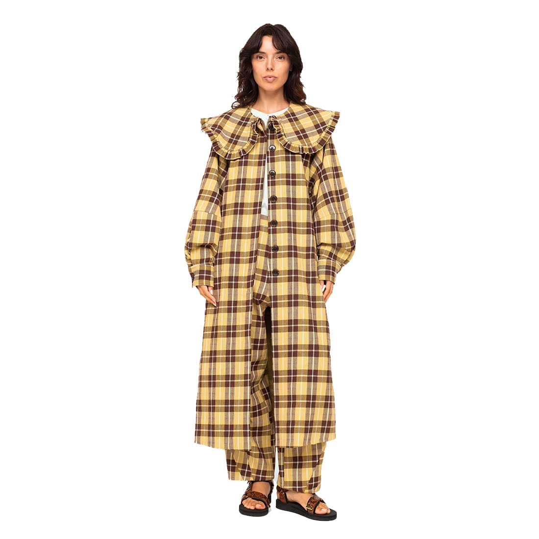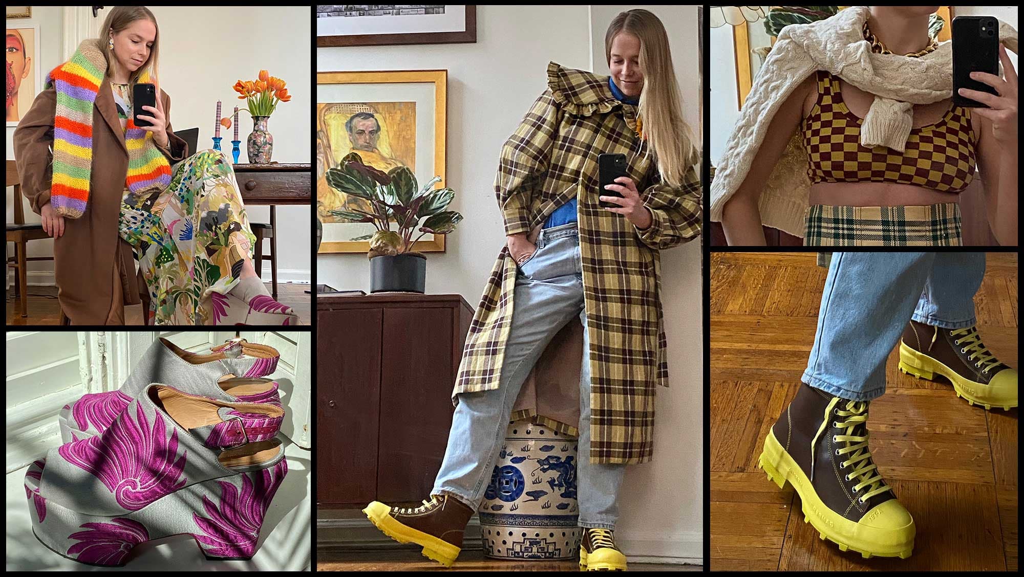 “I’m probably not the only person who’s gotten a little bored with their closet. In the spirit of mixing it up, I’ve started pulling out summer dresses and trying to winterize—here with a long cashmere coat I found shopping men’s vintage (best for that XL shoulder) and a cozy Ganni sweater. The giant platforms probably pissed off my neighbors, but the colors definitely improved my spirits!”