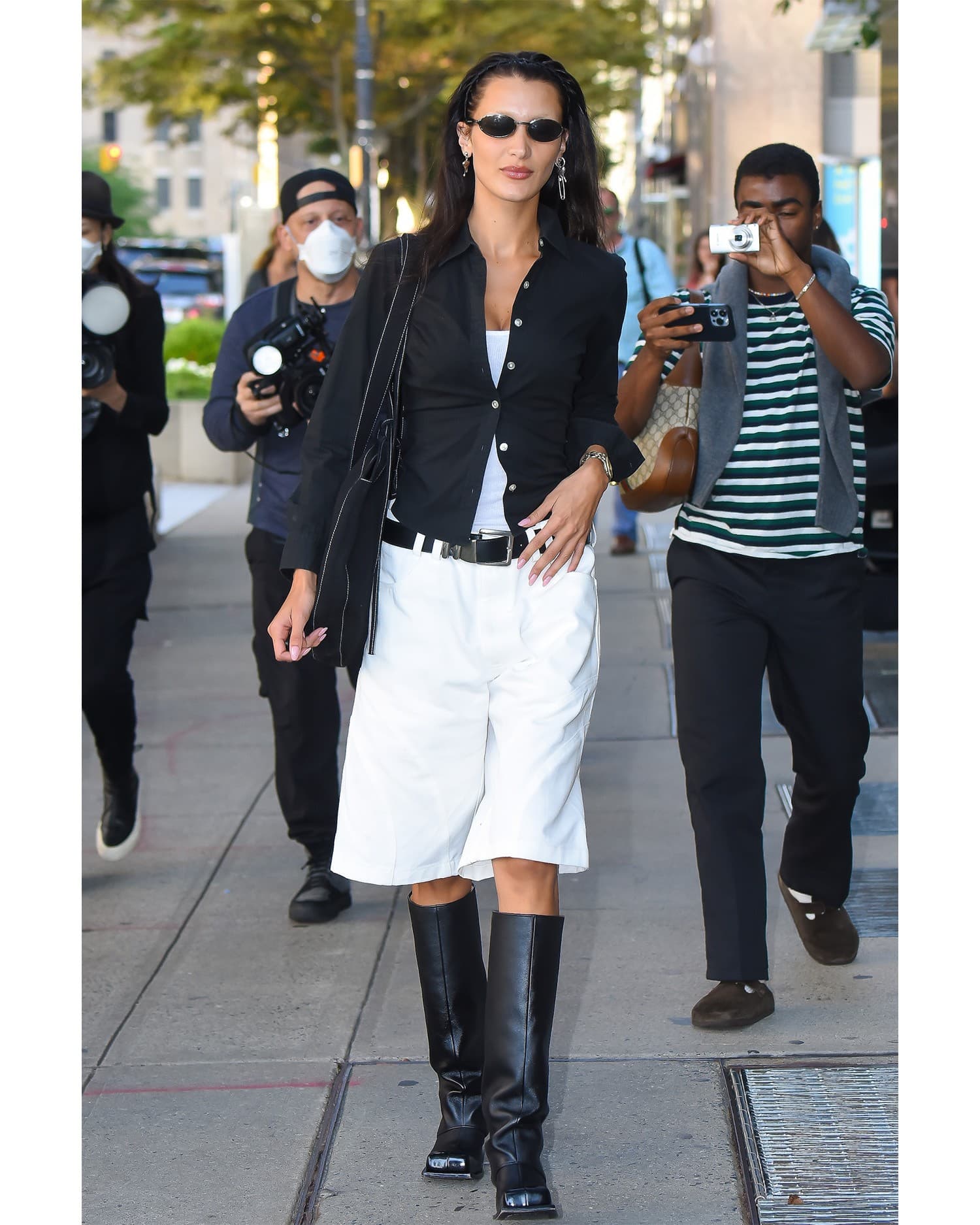 Bella Hadid is a master of demonstrating that traditionally unflattering clothes can actually be quite flattering. While 95% of this is due to her being Bella Hadid, I think this particular outfit is universal. A good black and white pairing is eternally chic, and boots, sunglasses, and the right bra gives the look a tasteful edginess.