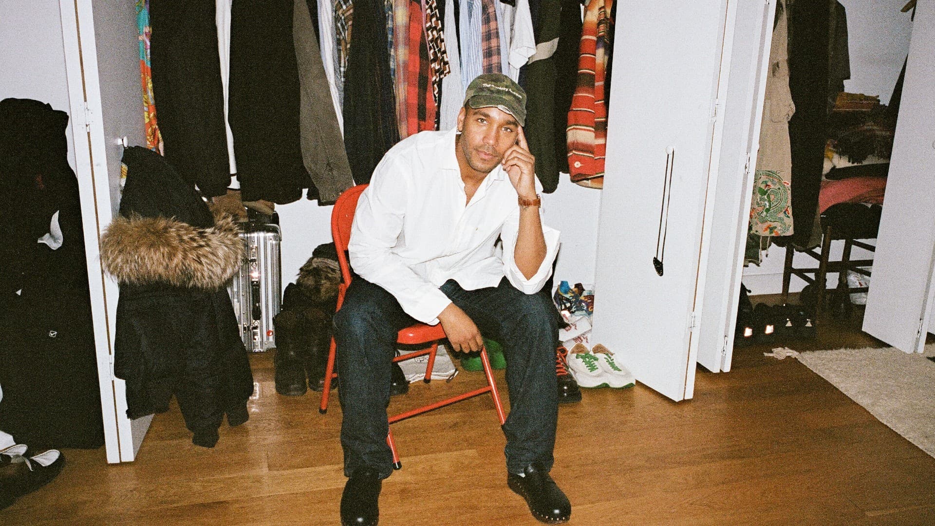 Prior to our first encounter, stylist Marcus Allen’s reputation as a collector had informed what little I knew of him. Founder of The Society Archive, a collection of designer goods from past decades, the young creative has essentially built a reputation (and a subsequent visual language) on his obsession with a collection of vintage Abercrombie & Fitch among other powerhouses of the late ‘90s and early aughts. Walking into his downtown New York apartment, I was surprised by how sparse it was—not at all what I expected. Peel back the white-washed doors of the closets lining his entryway, and you’ll find button-downs and trousers hung in a uniform manner next to stacks of knits. This is the sartorial fruit of an editor, not a hoarder. (To note, his professional collection is now stored elsewhere.)