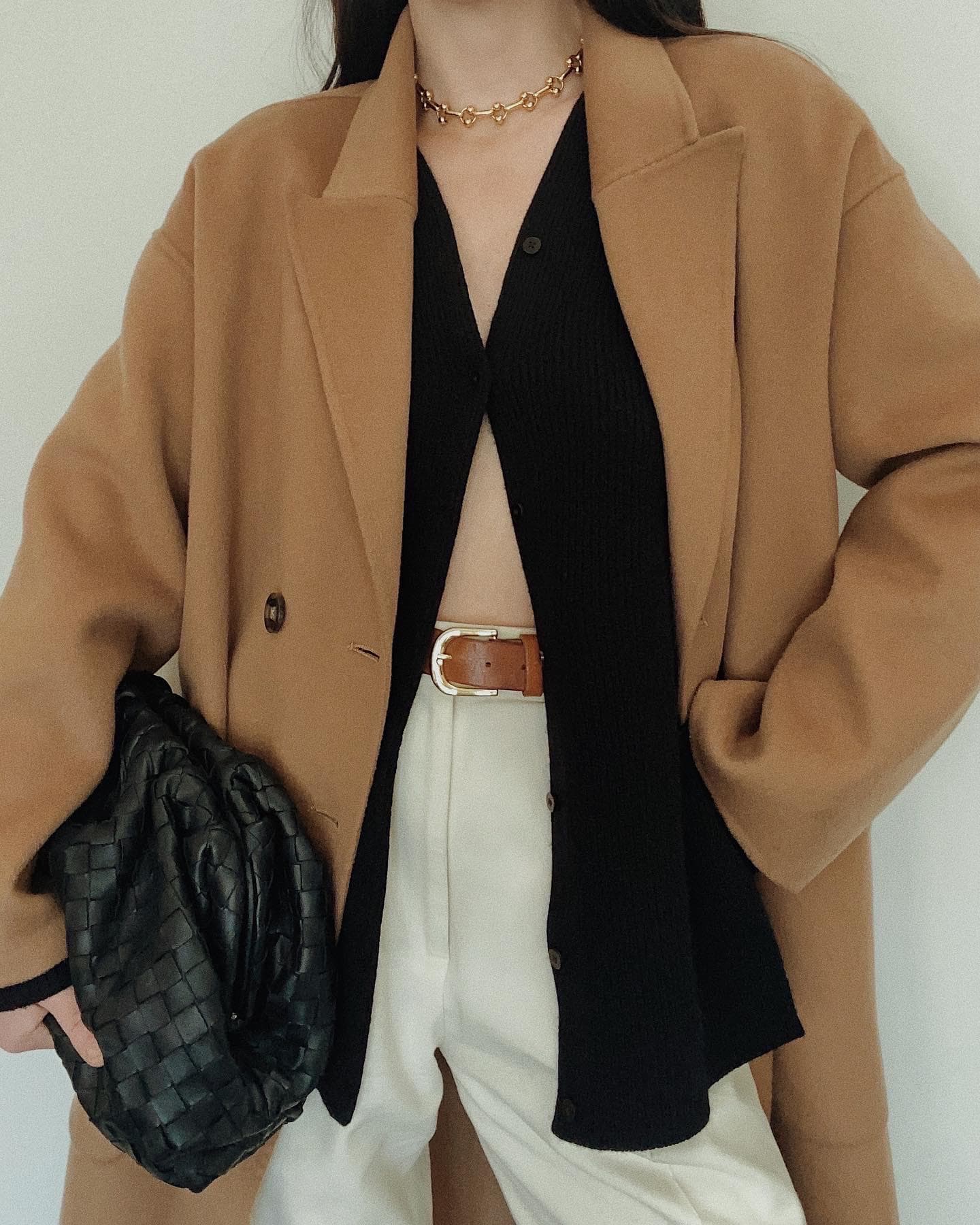 “Oversize blazers and coats with, as I was saying, a wide-leg pant. I pair almost everything with an oversize blazer, and then on top of that, if it's winter, I love an oversize coat. One of my favorite coats is actually from & Other Stories, but I bought it in a size 12, so people always think it's Celine or the Row. I think people need to get over their association with what size they're wearing. For me, I always try to size up in outerwear. I think you can take a fast-fashion brand and make it look way more luxe. Then sometimes, I'll tailor the arm length because that's where it can sometimes look like you're wearing your dad's coat. The same goes with Zara; I buy most of their blazers in usually a size 8 or a large as opposed to my typical size, which would be like a 4 or a S/M. I also love Petar Petrov. He has a coat that I've been wearing nonstop. I love Isabel Marant for her oversize blazers.”
