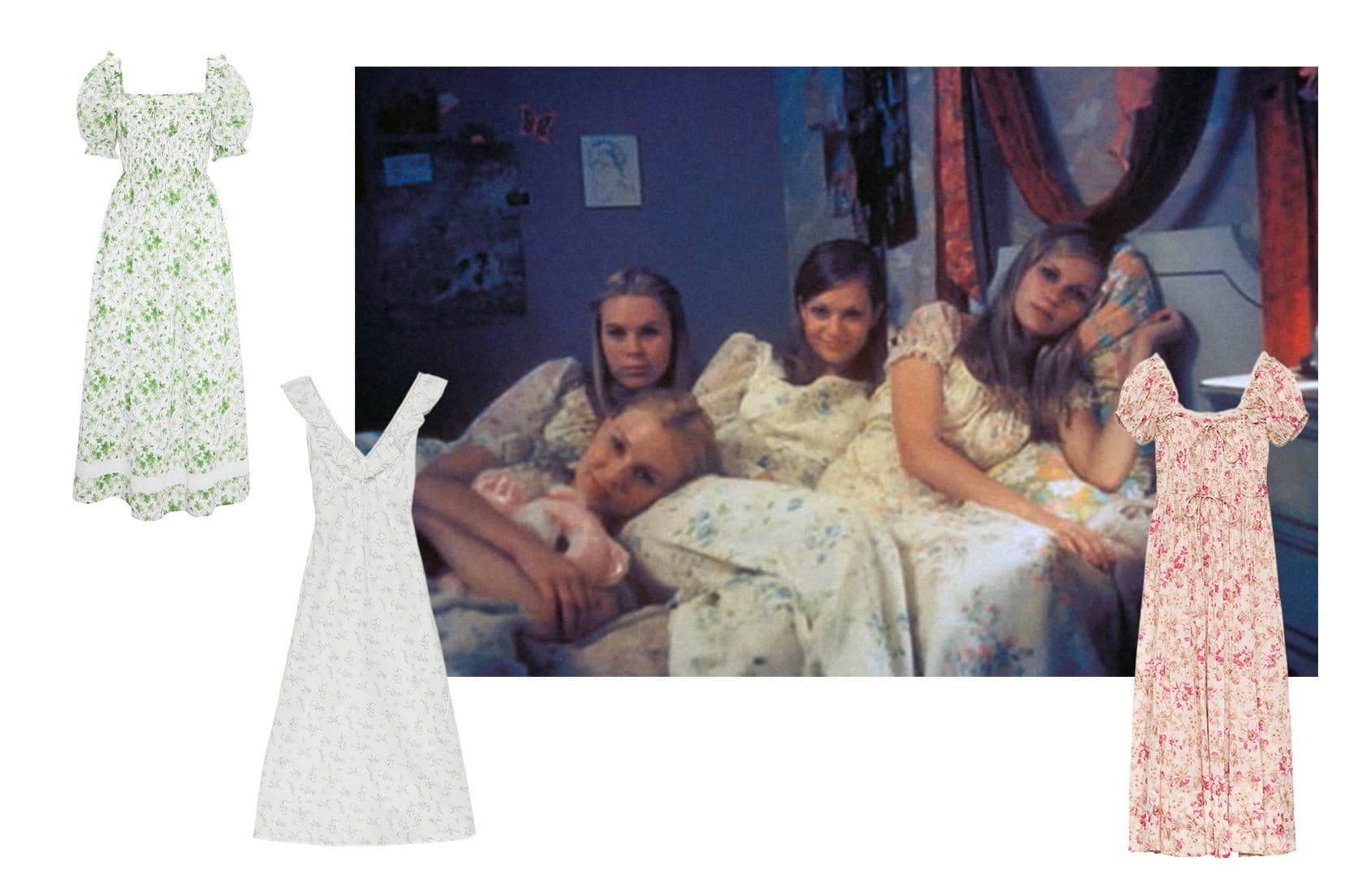 A personal favorite of mine, The Virgin Suicides exudes summer. Drenched in golden light, buzzing with the whir of cicadas, and orbiting around the listless isolation of the Lisbon sisters, the film—written and directed by Sofia Coppola, and based on Jeffrey Eugenides’s bestselling novel—is a fever dream of feeling. Set in the mid-70s, it explores the Lisbon sisters’ coming of age and longing for autonomy in a highly controlled home environment, which is echoed in the nondescript ensembles they don throughout: boxy, sexless school uniforms and demure prairie dresses that read more girly than grown-up. Though ultimately a tragedy, this film is a dreamy masterpiece of suburban melancholia—and twenty-five years later, its aesthetic is just as timeless as ever. Channel the film’s sweet 70s style with feminine dresses in airy fabrics finished with delicate florals.