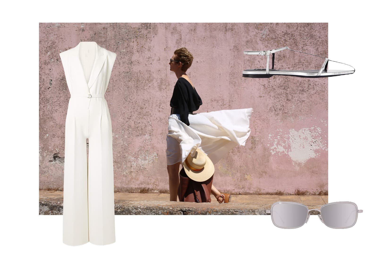 SHOP NOW: Norma Kamali Belted Jumpsuit; Loewe Anagram Sunglasses; Jil Sander Flat Sandals.