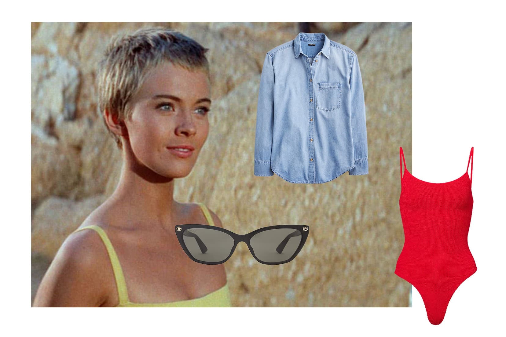 Featuring American actress and New Wave icon Jean Seberg, Bonjour Tristesse has become a cult classic. While its plot culminates in a manipulative scheme with harrowing consequences, the movie is synonymous with its bold aesthetic choices: alternating between a present day shot in black-and-white and flashing back to the past, which is captured in full color on the Cote d’Azur. That juxtaposition mirrors the interiority of Cécile—played by Seberg—and her outfits follow suit. While luxuriating by the sea, Cécile lives in one-piece swimwear in bold primary hues, which she covers up with an oversized chambray shirt, at times worn open or tied at the waist. Stripes and gingham accent her additional daytime looks—summer’s perennial signatures. A vibrant red swimsuit will stand out on any coast—and a chambray shirt and classic cat-eye complete it perfectly. Pro tip: size up in the shirt for a relaxed fit.