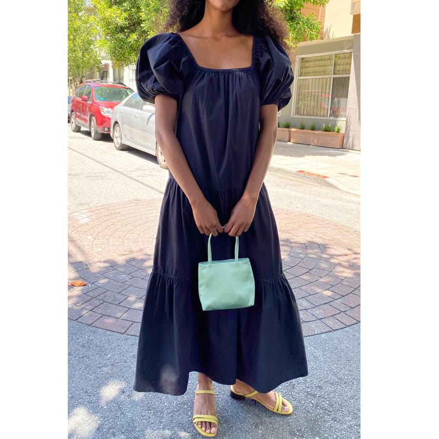 There is no duo as chic as a black dress paired with a bright red lip. The puffed sleeves on this otherwise casual maxi dress add a tasteful elegance that can be dressed up or down. Use this new lip gloss by MAC to add a pop of opaque red to the lips while plumping them at the same time.