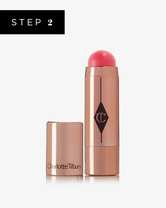 Still using cream formulas to start, apply a stick cream blush to the apples, aka the largest mounds on your cheeks when you flash that smile. With a flat-topped dual-fiber brush (meaning it has two types of bristles) like