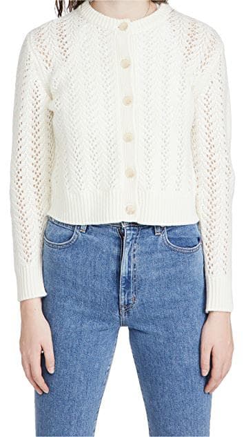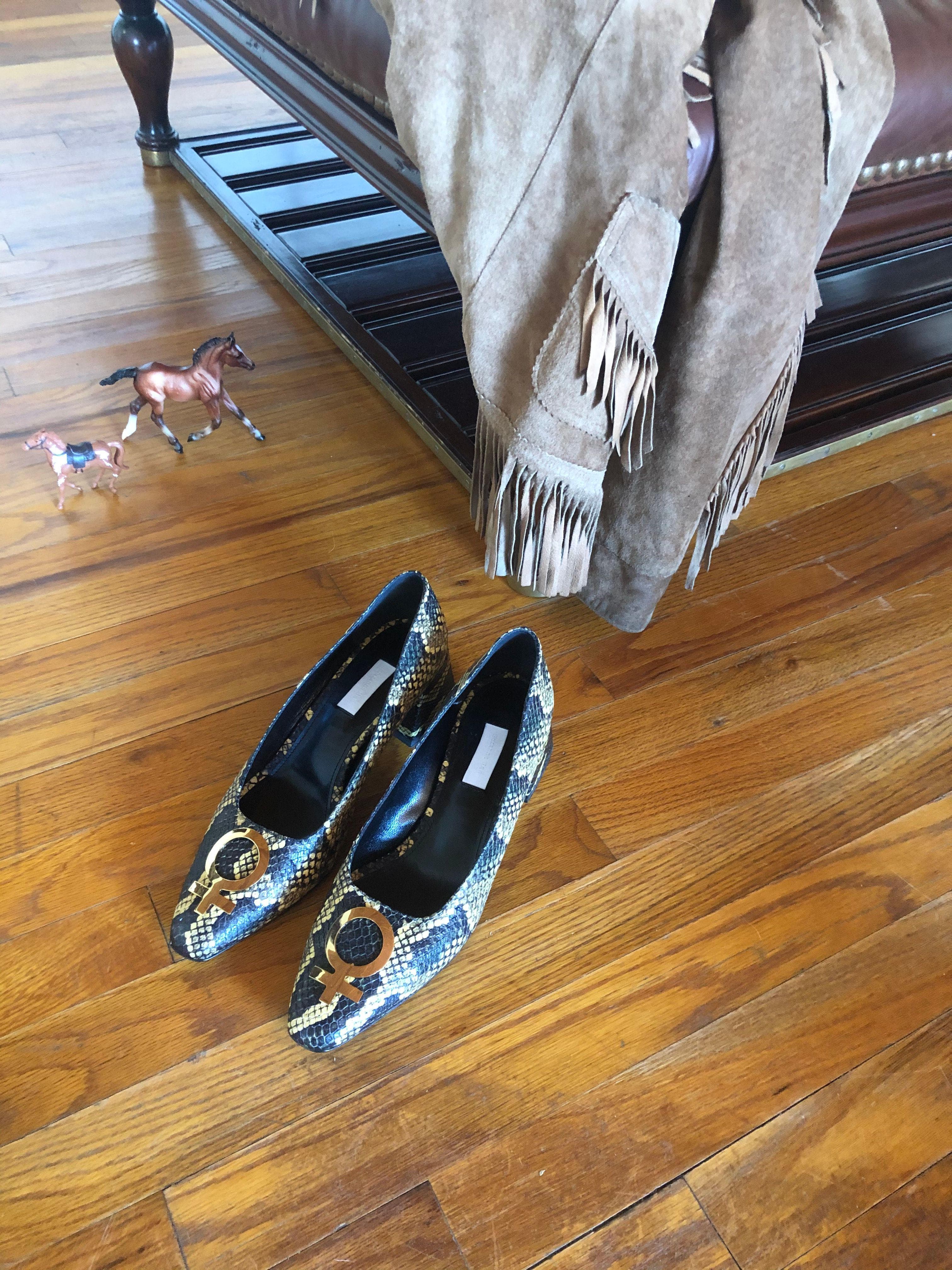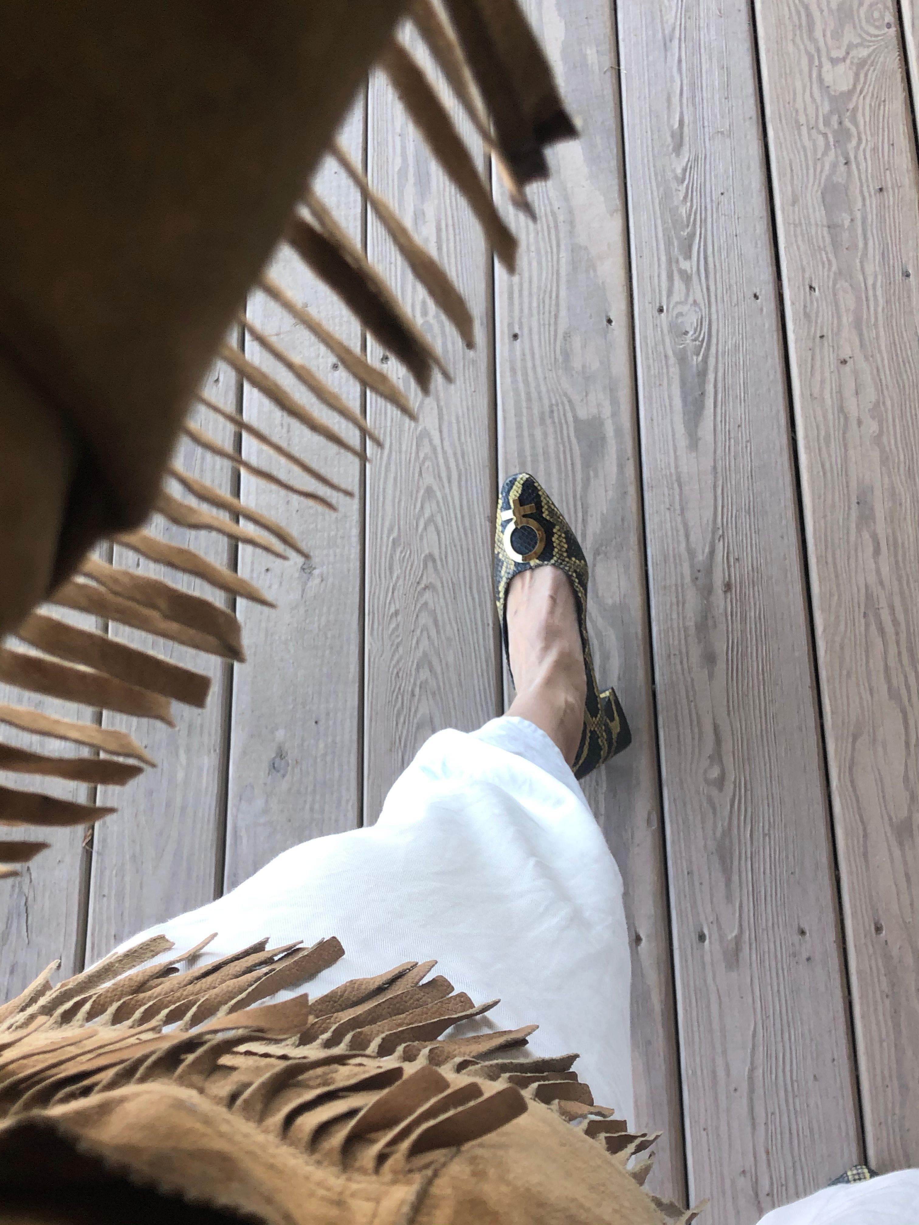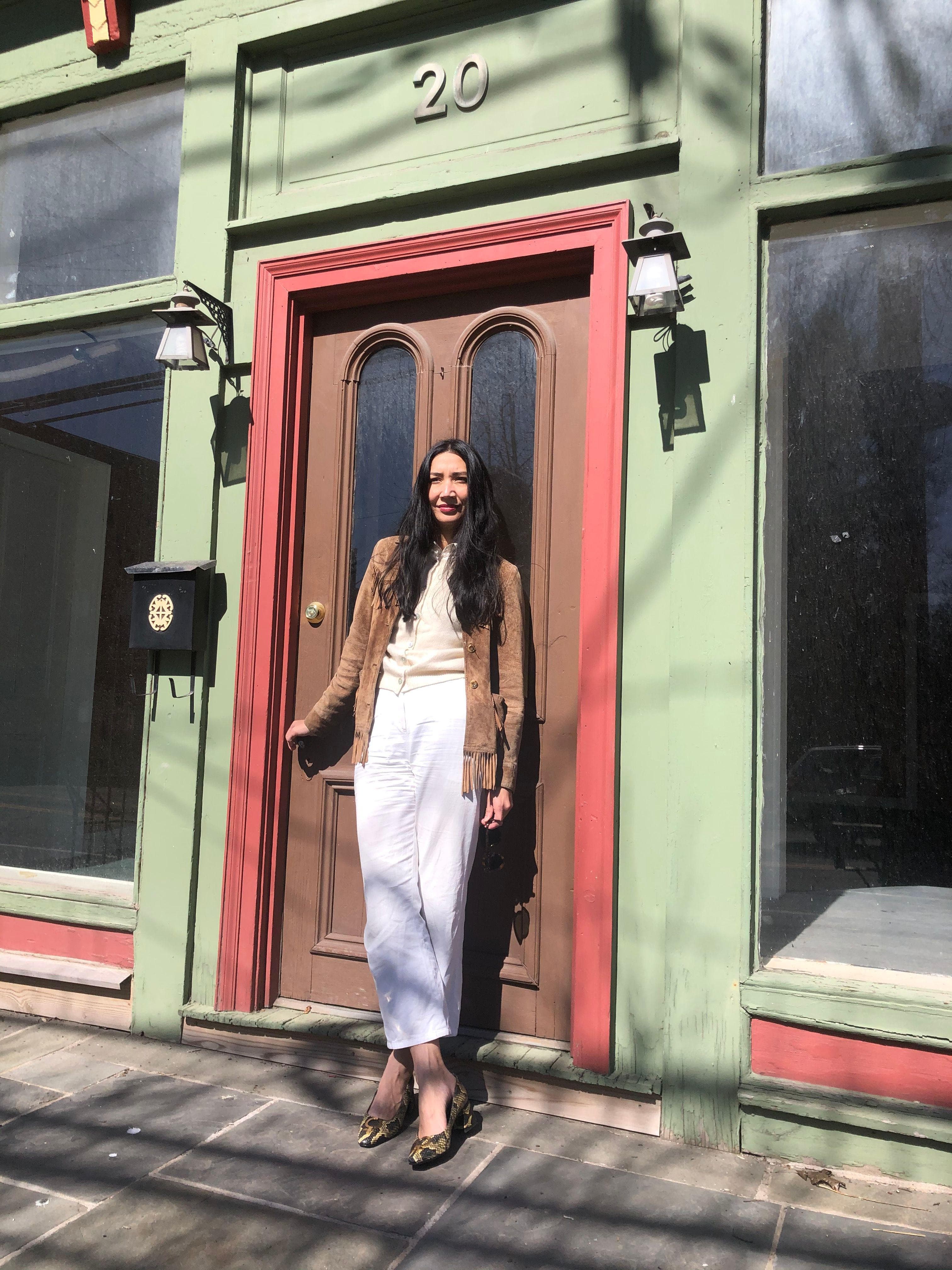 Photo: Courtesy of Suzanne Rae"This is my in-town look. LOL. I wore it in NYC a few days ago when we drove upstate, so I'm wearing it again today to go visit our new country store-front location. I've got on a Suzanne Rae cashmere cardigan, with a Benetton button-down blouse that I've had since high school, and a pair of old Suzanne Rae white jeans. I'm also wearing our faux snake Feminist Pumps and this suede fringe jacket that I've also had for almost 20 years. Here's an example of my wearing the pearls I mentioned above; I kind of dig the pearls juxtaposed with the fringe."