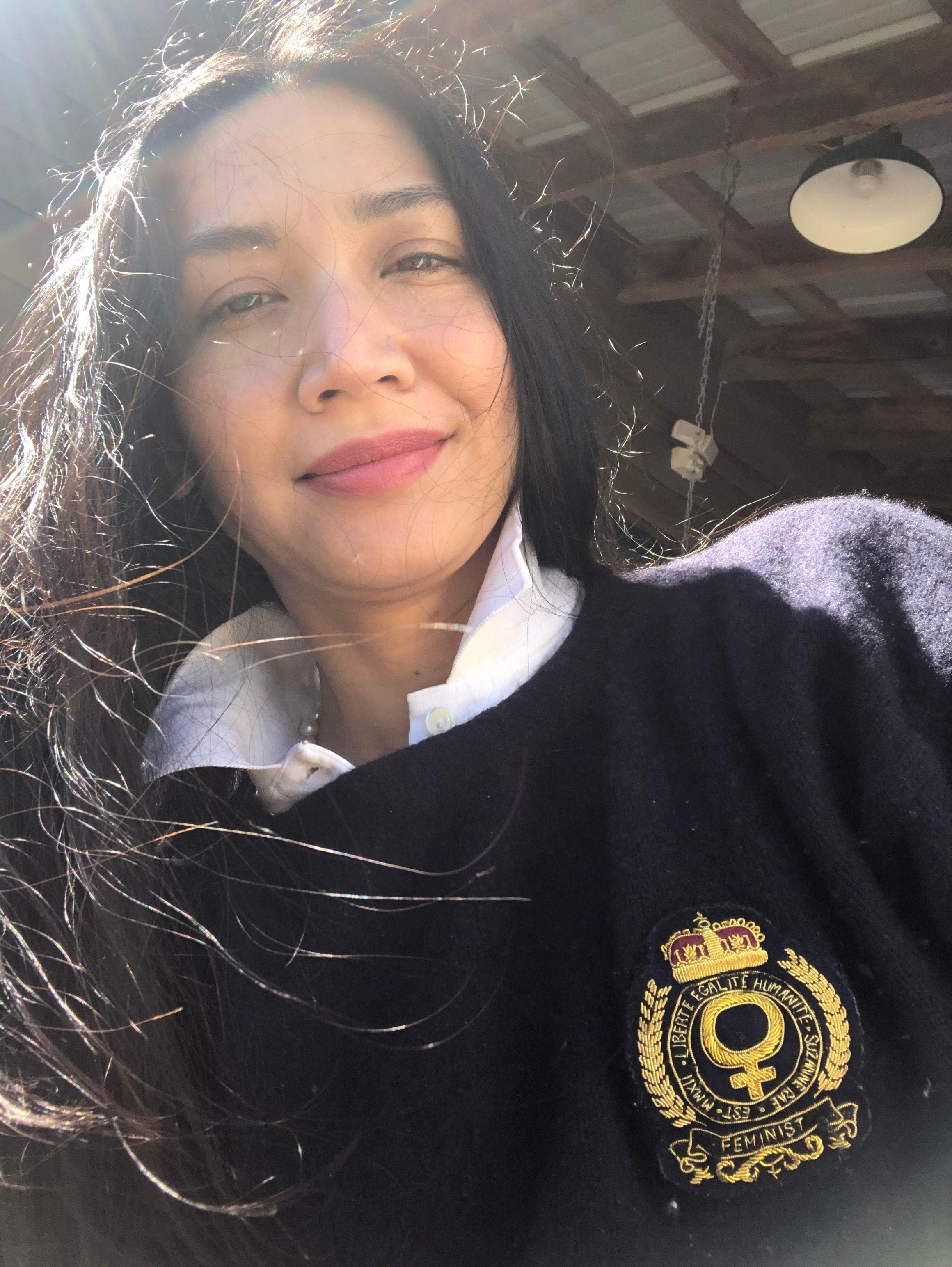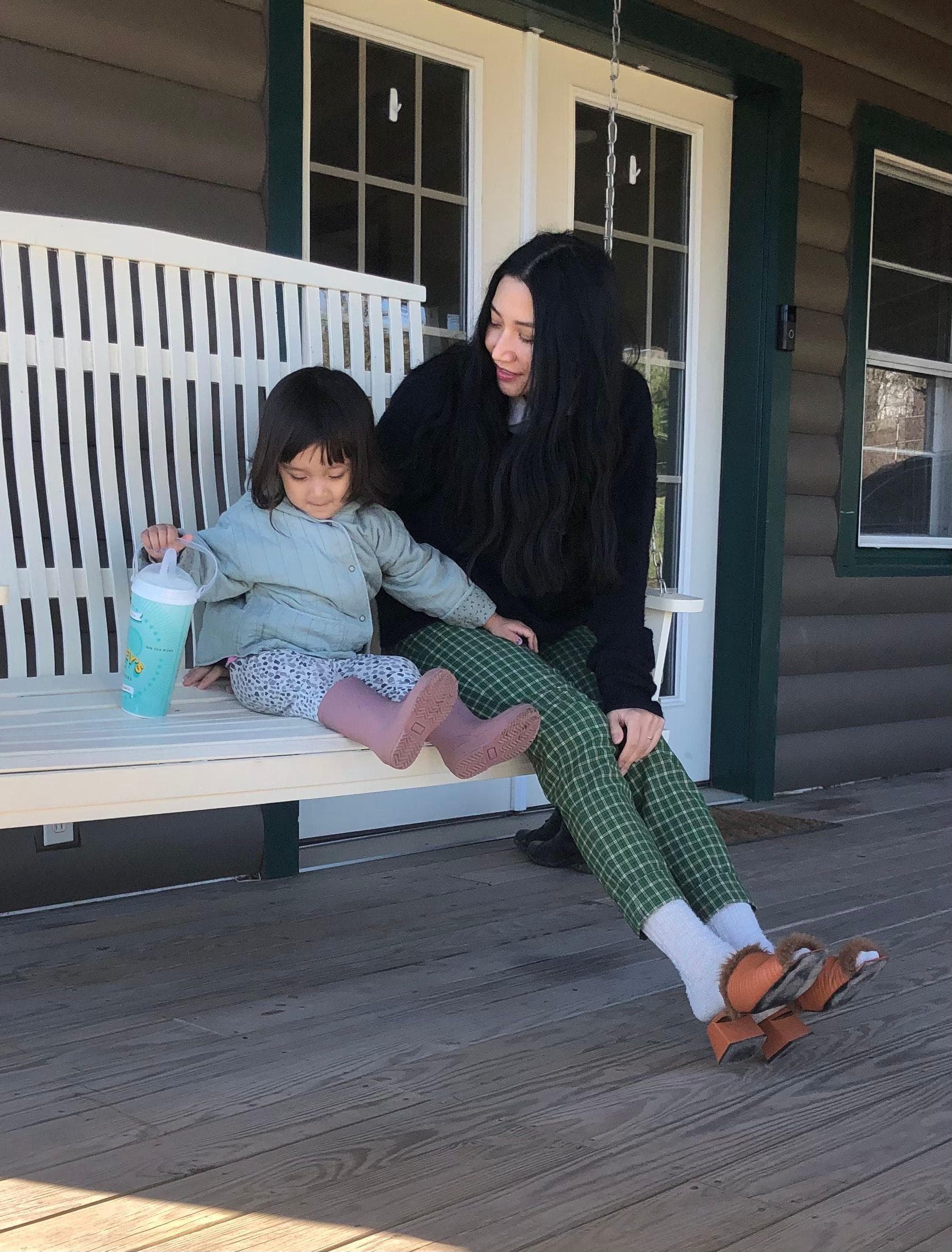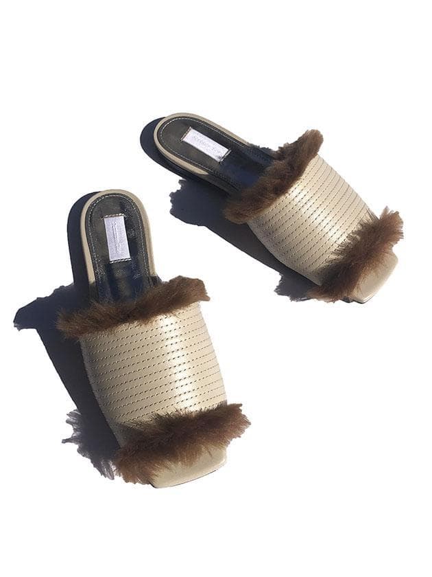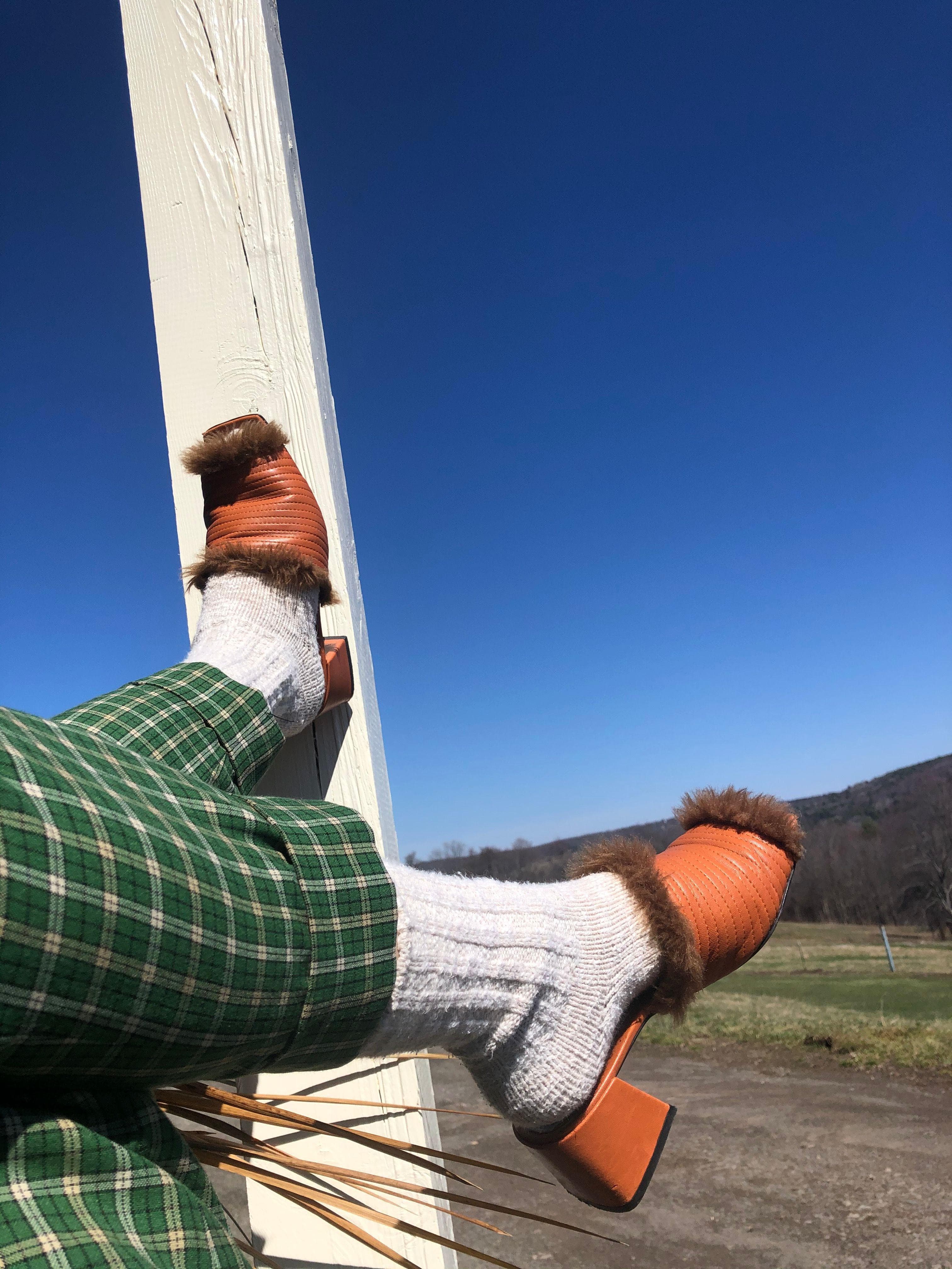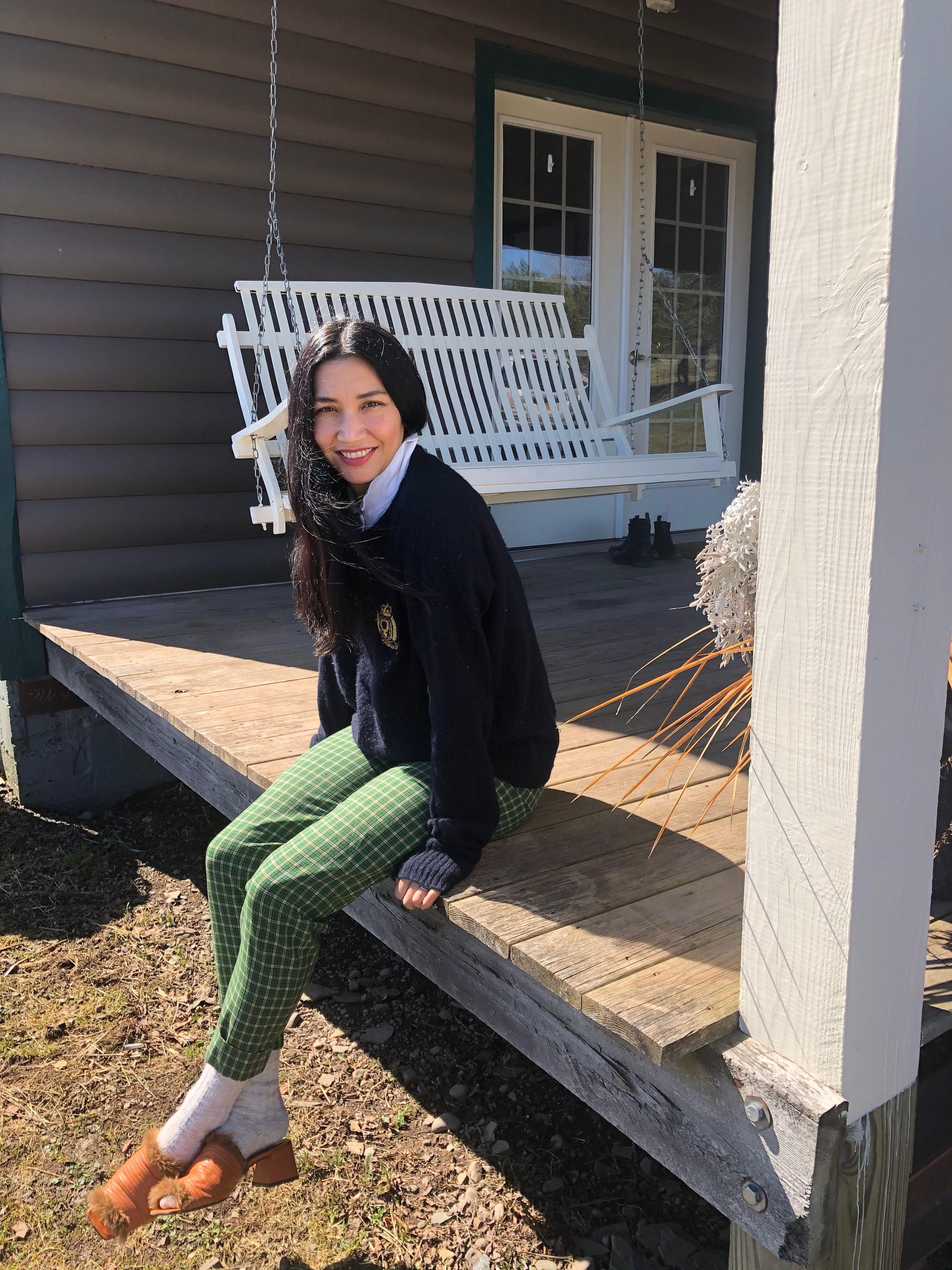 Photo: Courtesy of Suzanne Rae"This is another repeat offender that may have been seen several times on Instagram—or at least a variation of it. I'm wearing a pair of vintage wool plaid pants I got at a Flea Market in Lucca, Italy with an old Lacoste Polo (also probably 20-25 years old) and a Suzanne Rae feminist crest recycled cashmere sweater. I'm also wearing a pair of cotton socks with our faux mink mules, which we just redid in a flat version. I typically wear this ensemble usually when I'm working from home, but it's easy enough to wear outside by just throwing on a pair of loafers.