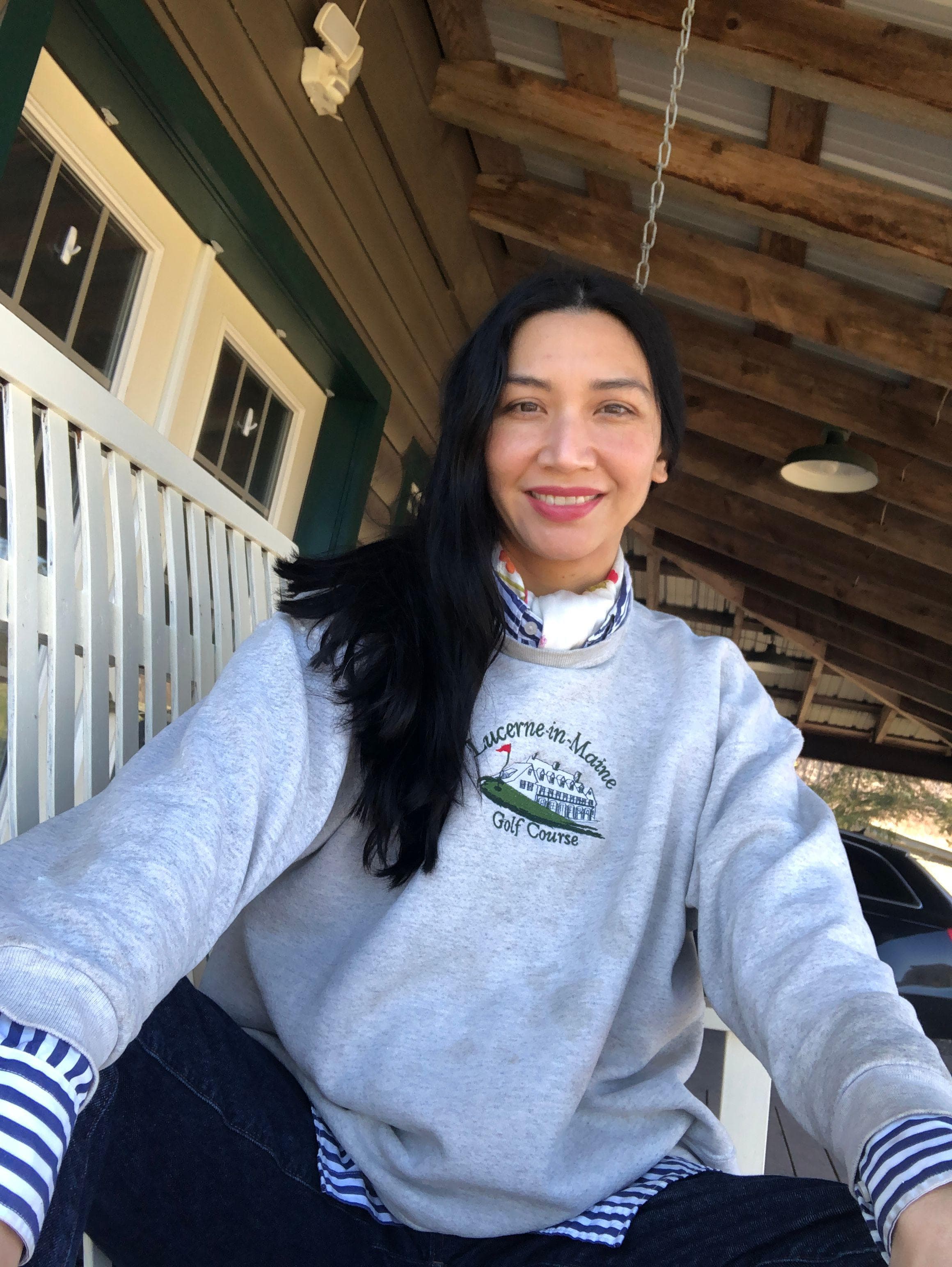 Photo: Courtesy of Suzanne Rae"First of all, I think anyone who knows me has seen me wear this golf sweatshirt at least once or a dozen times—for better or for worse. This is my most repeated offender; I may wear this outfit or variations of it several times every week. I'm wearing it here with an old pair of jeans, my husband's button-down shirt, a Ferragamo silk scarf, vintage barn coat, Celine sunglasses, and my Ariat paddock boots that my husband and two daughters also have. I wear this in and around the country house, walking around the fields, and when I go riding I just switch out the jeans for a pair of breeches."