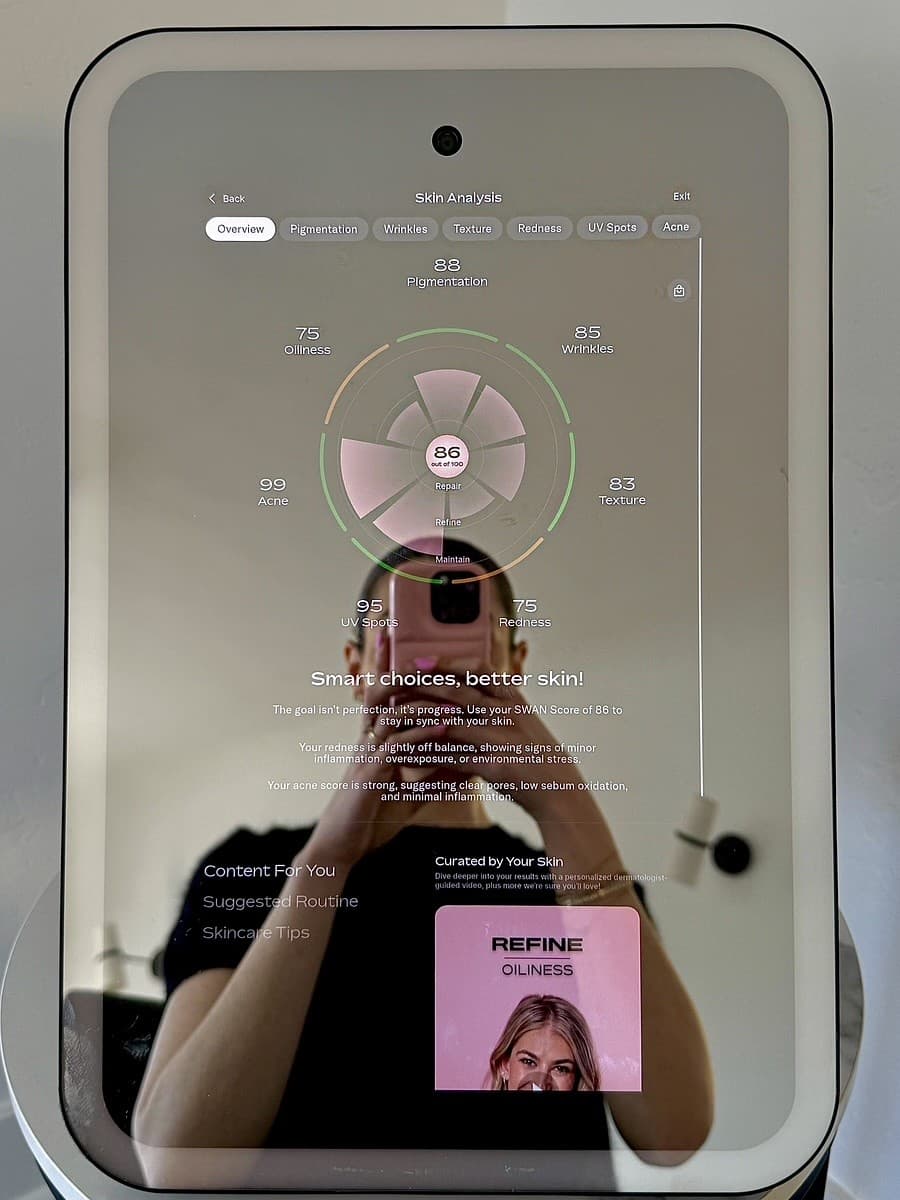 The mirror scans my skin for concerns like wrinkles, oiliness, texture, and UV spots, scoring each on a scale—higher usually means healthier. It suggests routines and products based on your results. I did about three to four scans just to see how accurate it was, and the scores varied by about five to 10 points each time. It gave me a 100 acne score (aka perfect), even though I was actively breaking out… so take that with a grain of salt. That said, I really liked the skincare tips it gives based on your results. It did tell me to stop over-exfoliating, which is ironic because I still can’t seem to lock down an exfoliation schedule.