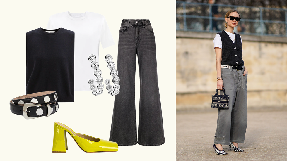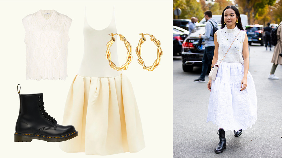The silhouette of a drop-waist dress is perfect for a sweater vest, and an edgy boot is the perfect twist to the otherwise ultra-feminine elements of the look. Finish it off with your go-to hoops or a chunky gold earring.