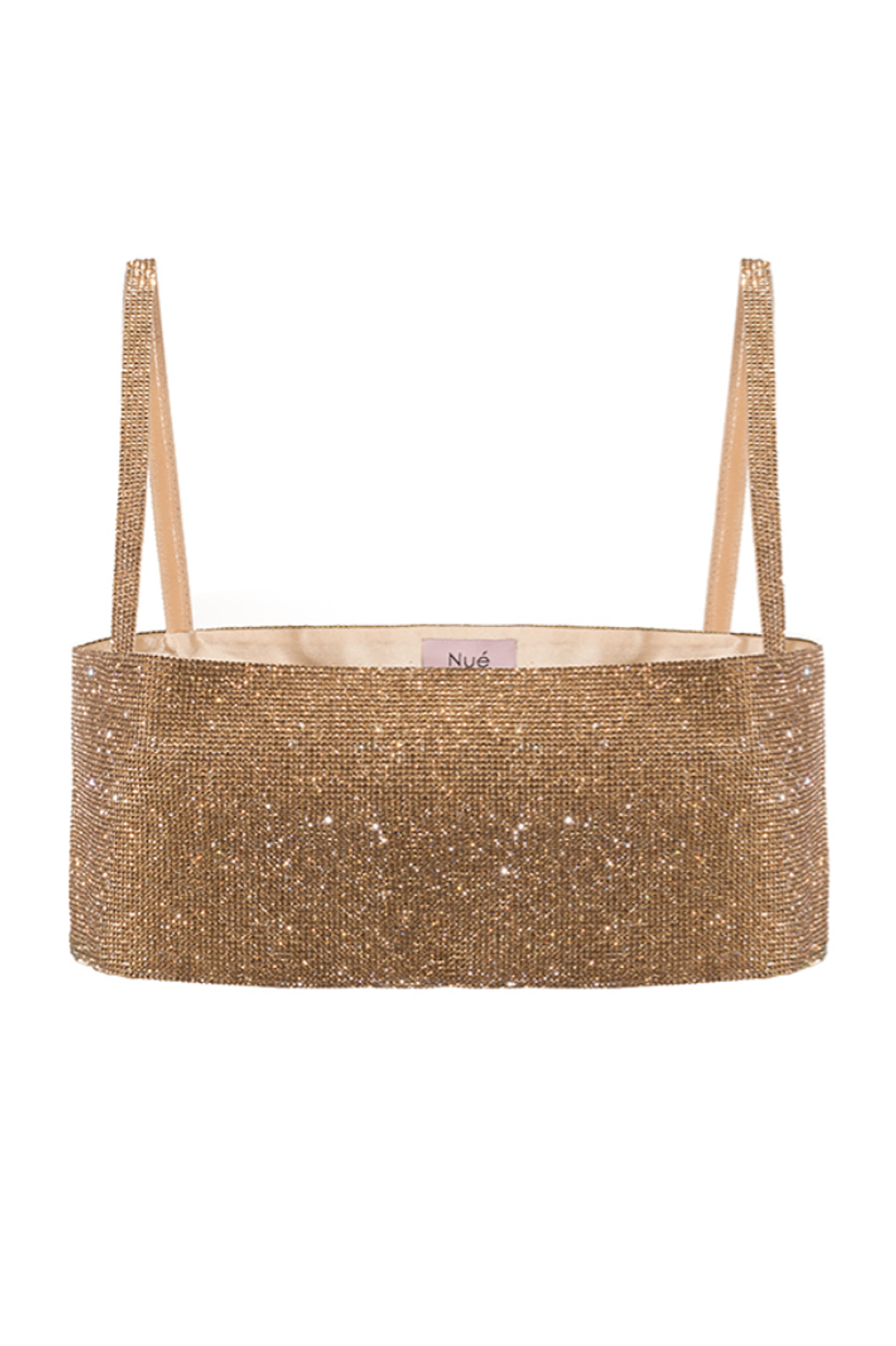 If you’re not ready to bare all in a bikini top, use it as a layering piece instead—perhaps beneath a glittering gold top as model Destiny Joseph does here. Counteract the flashiness of the top with trousers in a more muted hue and a wider silhouette.