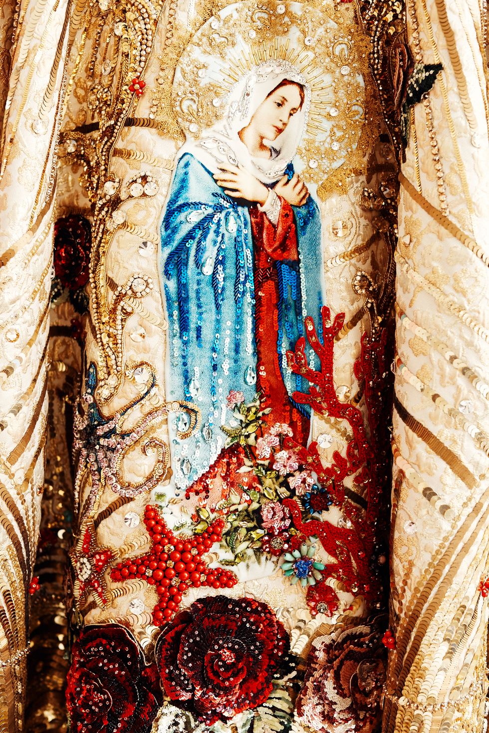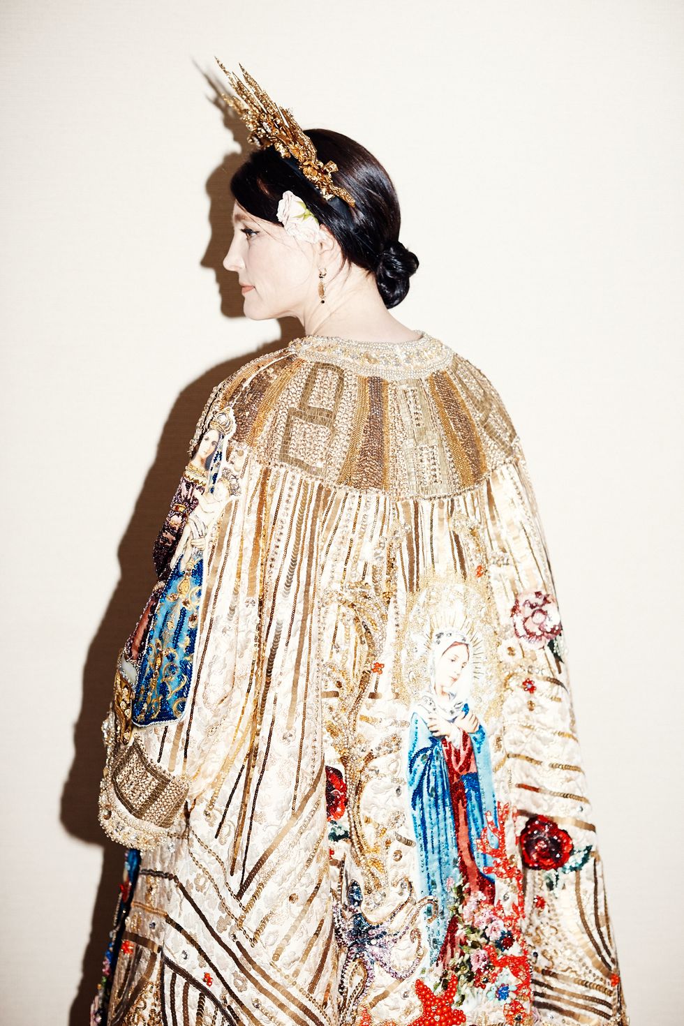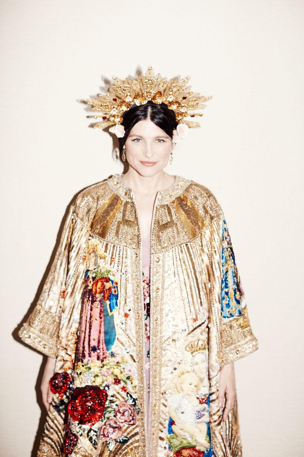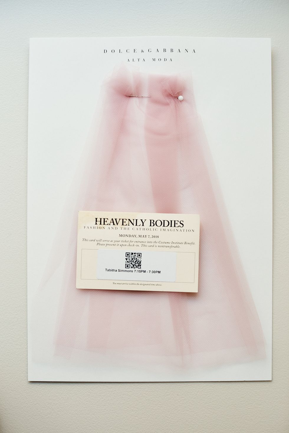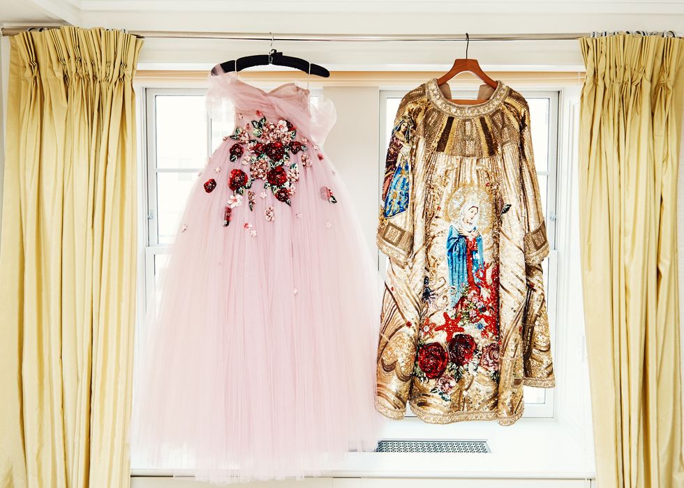 When we walk into the hotel room to get ready with designer Tabitha Simmons for the Met Gala, the first thing that catches our eye is a floor-length, glittering coat with an image of the Virgin Mary on the back. “It’s Dolce & Gabbana Alta Moda,” Simmons says from her perch on the makeup chair. A stunning blush tulle dress with its own splash of embroidered red roses hangs next to it. Complete with a custom Dolce & Gabbana crown, a sparkling clutch, and her own satin-and-crystal shoes, the look is a perfect representation of this year’s theme, “Heavenly Bodies: Fashion and the Catholic Imagination.”