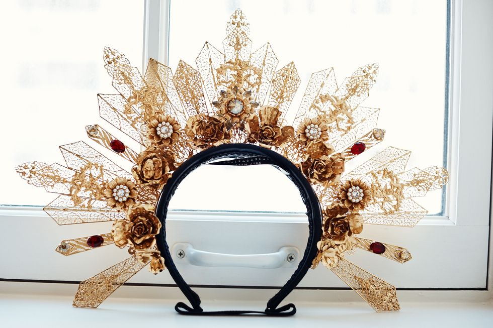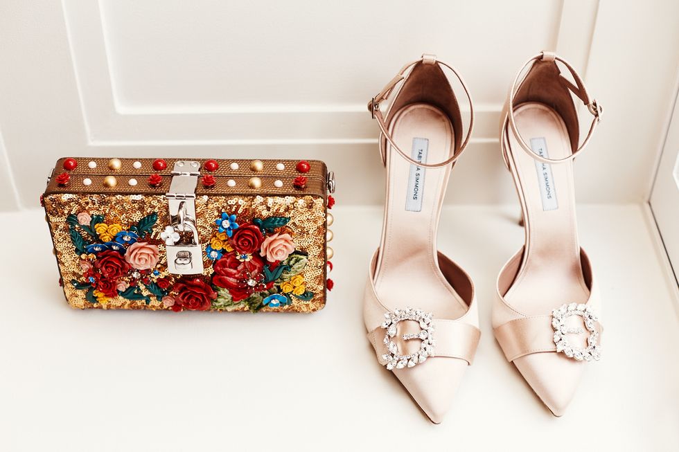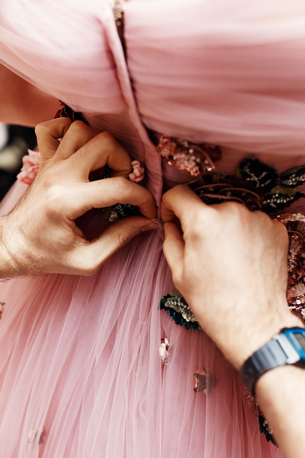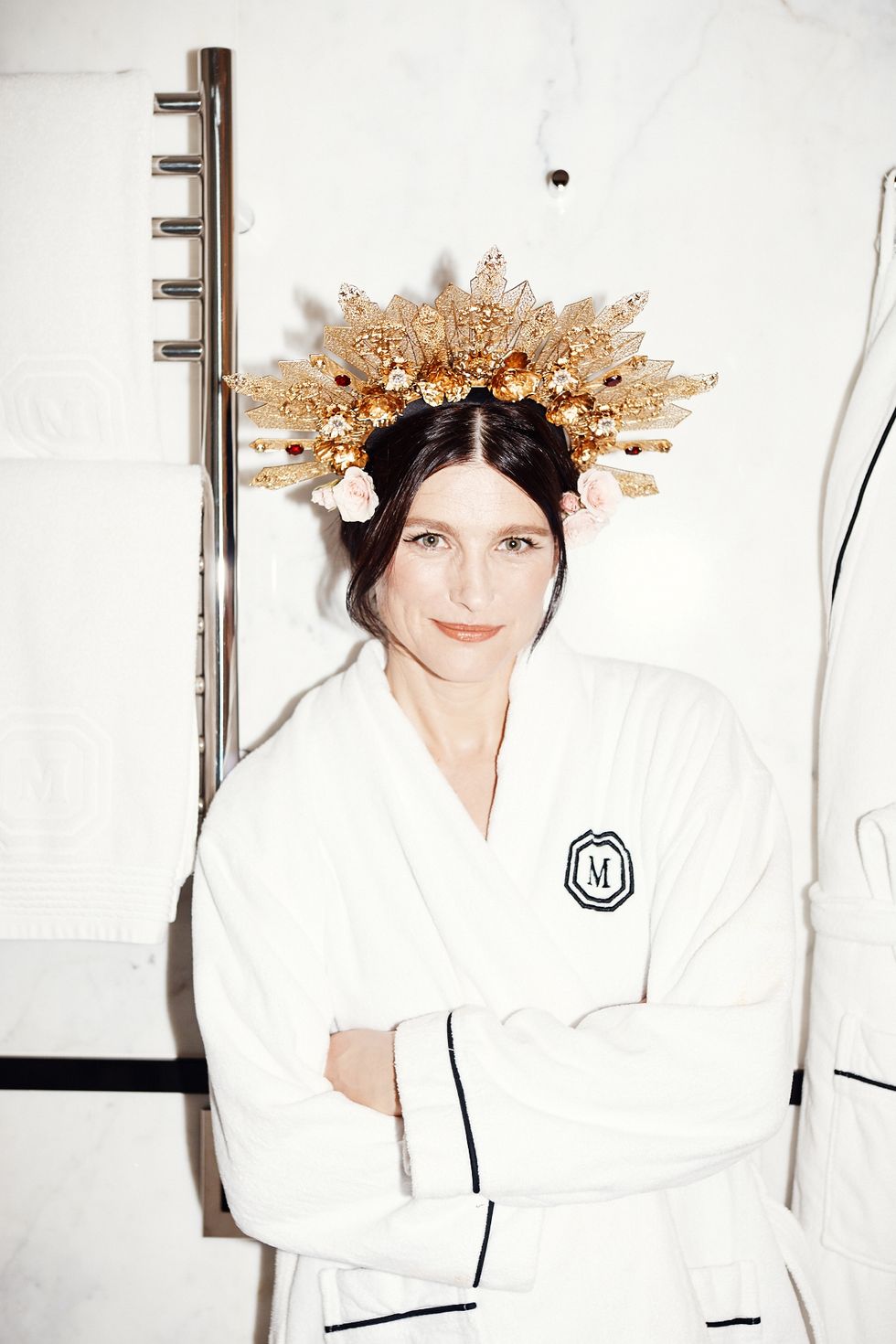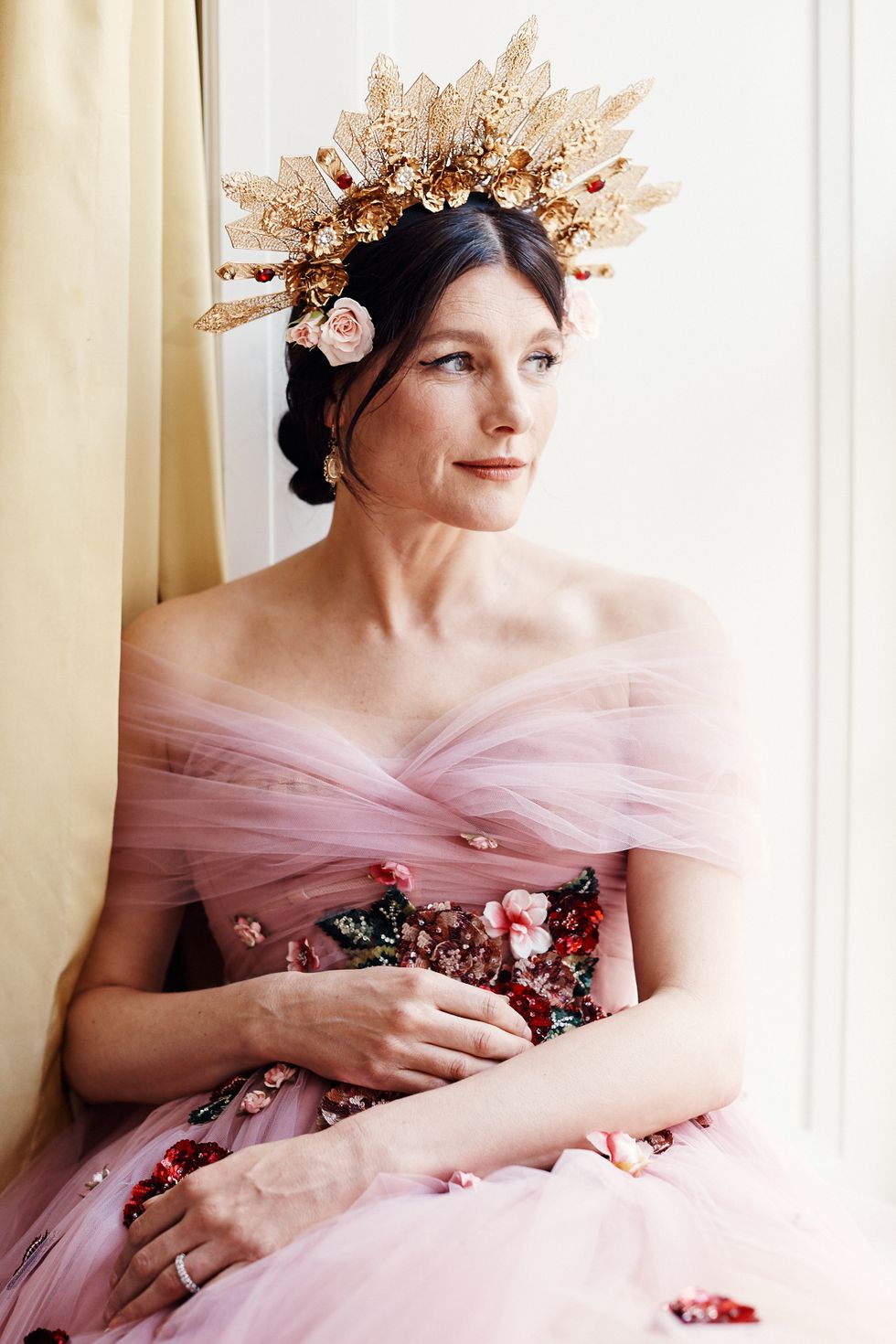 When we walk into the hotel room to get ready with designer Tabitha Simmons for the Met Gala, the first thing that catches our eye is a floor-length, glittering coat with an image of the Virgin Mary on the back. “It’s Dolce & Gabbana Alta Moda,” Simmons says from her perch on the makeup chair. A stunning blush tulle dress with its own splash of embroidered red roses hangs next to it. Complete with a custom Dolce & Gabbana crown, a sparkling clutch, and her own satin-and-crystal shoes, the look is a perfect representation of this year’s theme, “Heavenly Bodies: Fashion and the Catholic Imagination.”