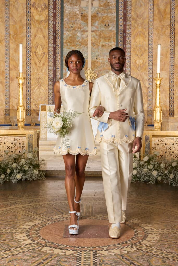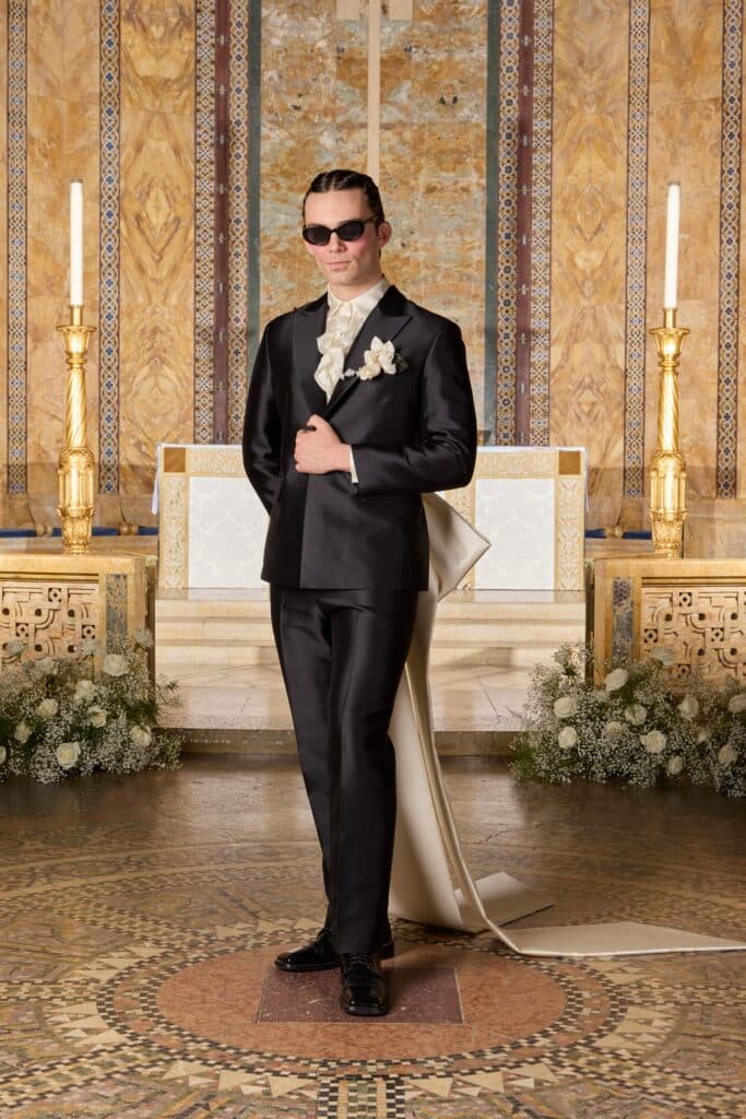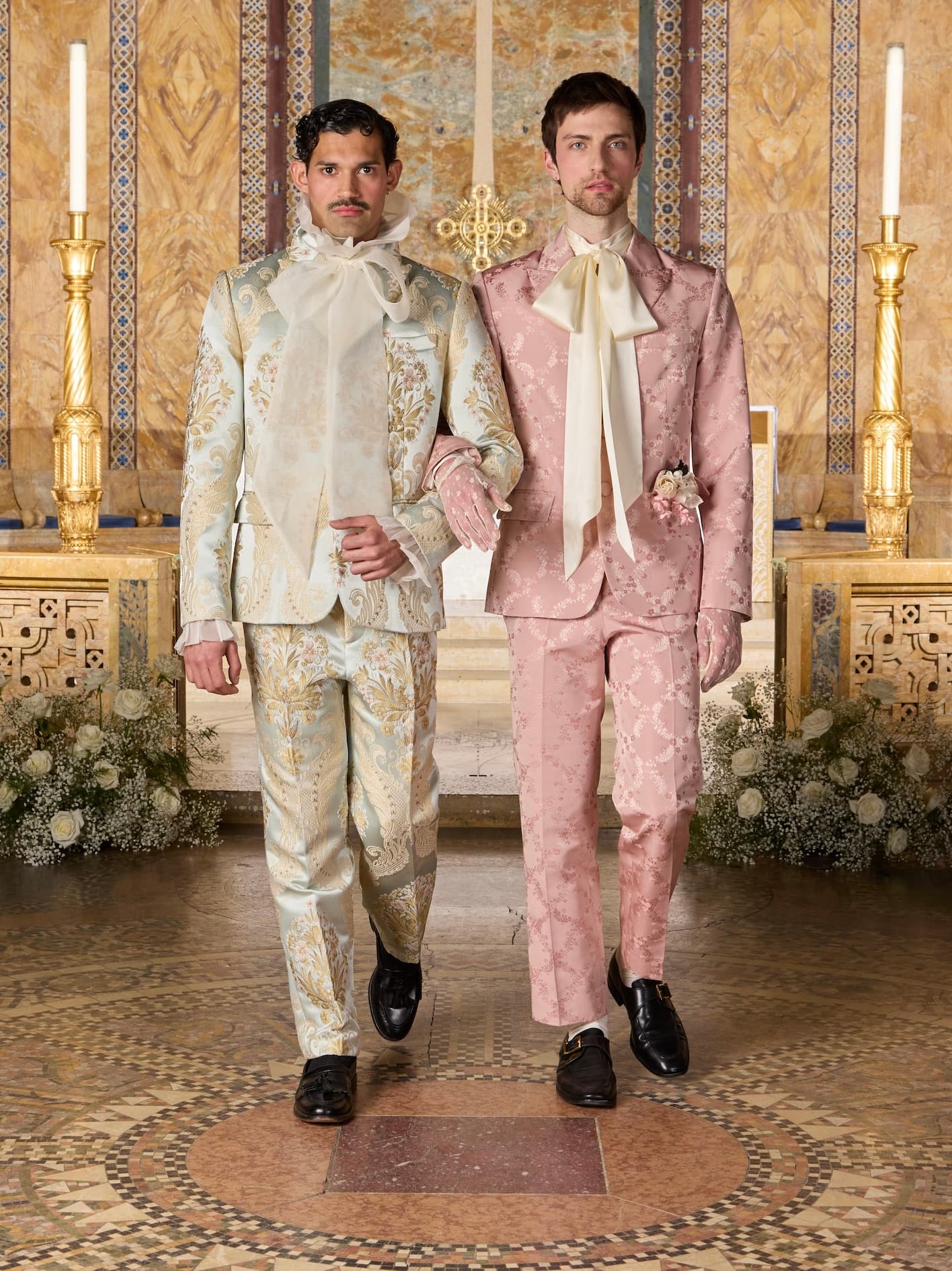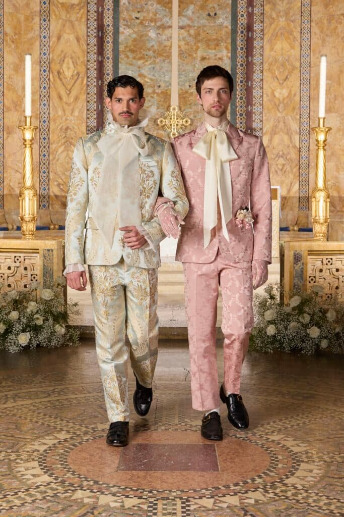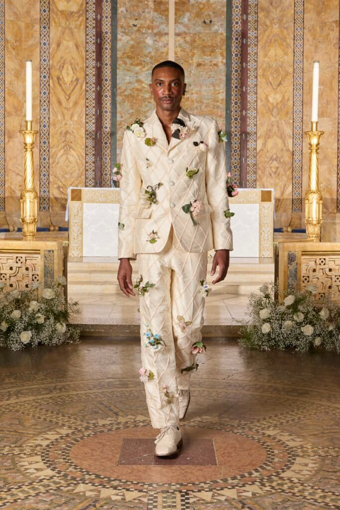The show culminated in our protagonist disconnecting with this love interest, but finding his ballerina pink Tanner Fletcher jacket left behind. Unwilling to lose the one of many people that he greeted that felt like home, he calls all suit-wearers back to the castle—from there, models in embellished, pastel, patterned, and floral suits with shirts complete with ruffs and pussy bows walked down the cathedral runway and the concept of suiting, especially for an event as traditional as a wedding, was reimagined.