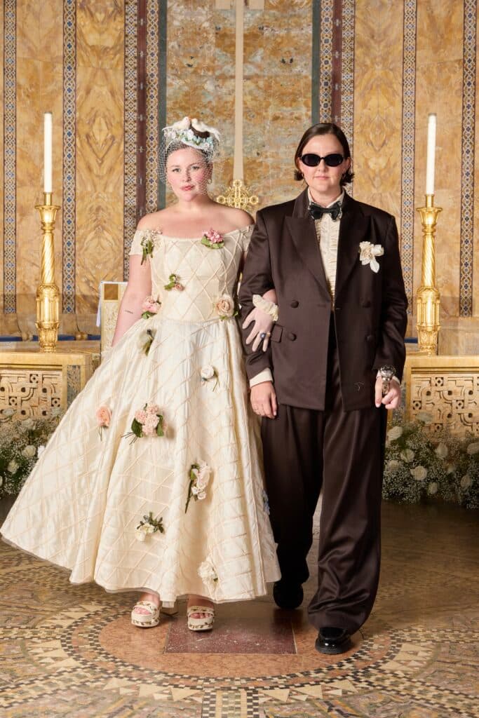 When the lights came on at Tanner Fletcher's bridal show in the beautiful grand cathedral in Midtown Manhattan on a Wednesday evening, one thing was clear: we were in a fairytale. Then, a voiceover rang through St. Bartholomew's Church, guiding us through the Cinderella-inspired story concept: potential spouses travel far and wide to attend a ball in hopes that they'll catch the eye of a young prince. He notes that none of them leave him with that if you know, you know feeling and that his fairytale might not end like the ones that we all devoured as kids—instead of falling for one of the women dressed in Tanner Fletcher's intricately designed bridal gowns, he falls for a man in a suit in the perfect shade of ballerina pink.