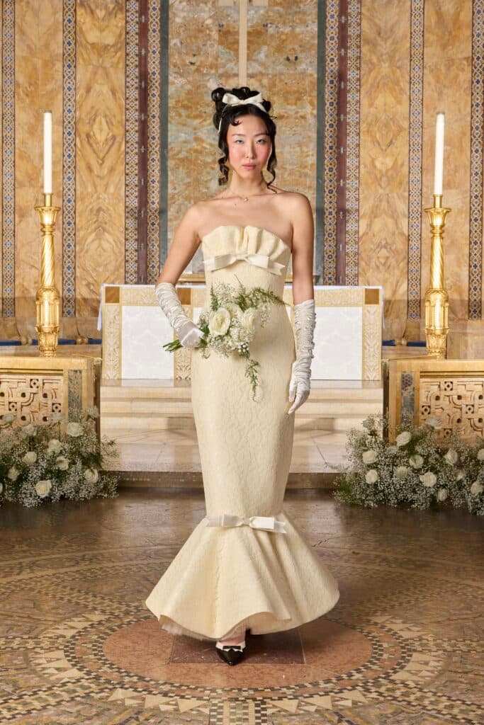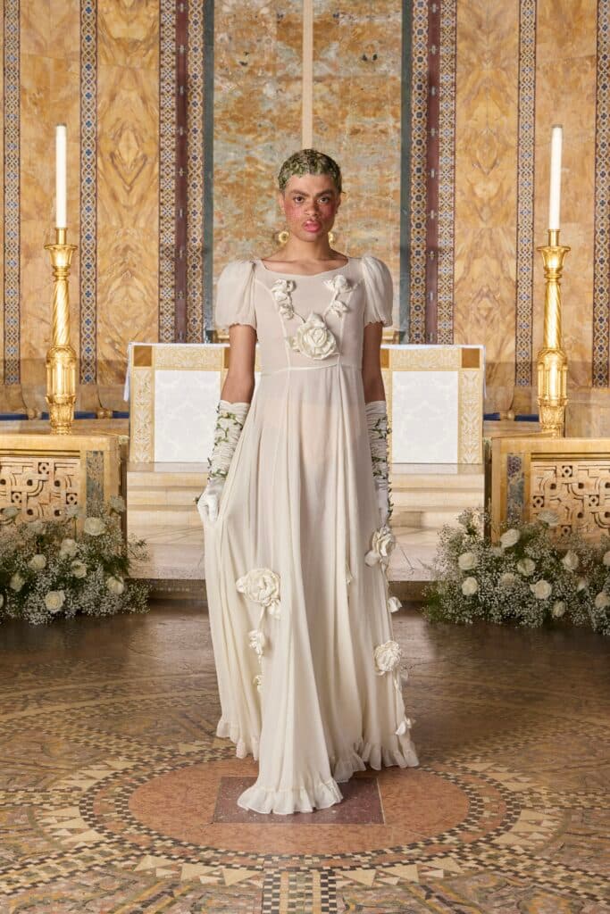 Selwyn TungolModels walked down the runway on their way to greet the prince in vintage-inspired looks fit for the modern bride—a variation of veil lengths, embellished headpieces, opera gloves, and more. "We love the '40s. We always go back to the '40s," Kasell said. "I think it's just very timeless. It's from a time where people were still making their own wedding dresses, so it's handcrafted in a way where every little detail is noticeable, even the puckers at the shoulder or the volume of the sleeve, and the delicate silks that are used." But, at the same time, a case is made for foregoing traditions that would have been interpreted as more controversial in that time period—a bride in a short dress, a bride in a dress that's not white, or a bride not wearing a veil at all.
