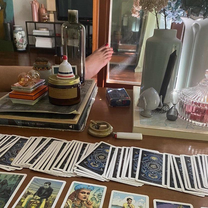 Photo: Courtesy of Instagram/@mariahostivessichThough it is advised by most distinguished tarot readers that your first deck be gifted to you by someone else, latecomers believe it's OK to buy a deck you feel particularly drawn to. “First of all, I recommend that you start with the Rider-Waite [deck] and the Oswald Wirth–designed book to study all the archetypes, symbols, meanings, and numerology," suggests Maria. “My go-to deck is the Cosmic Tarot by Norbert Losche, not the most well known for some reason, but I immediately bonded with it—you'll just feel it!" Maria adds. “There's also oracle cards," she continues. “They're so beneficial and way easier to use, even for a one-card pull in the morning when you want to have some food for thought."