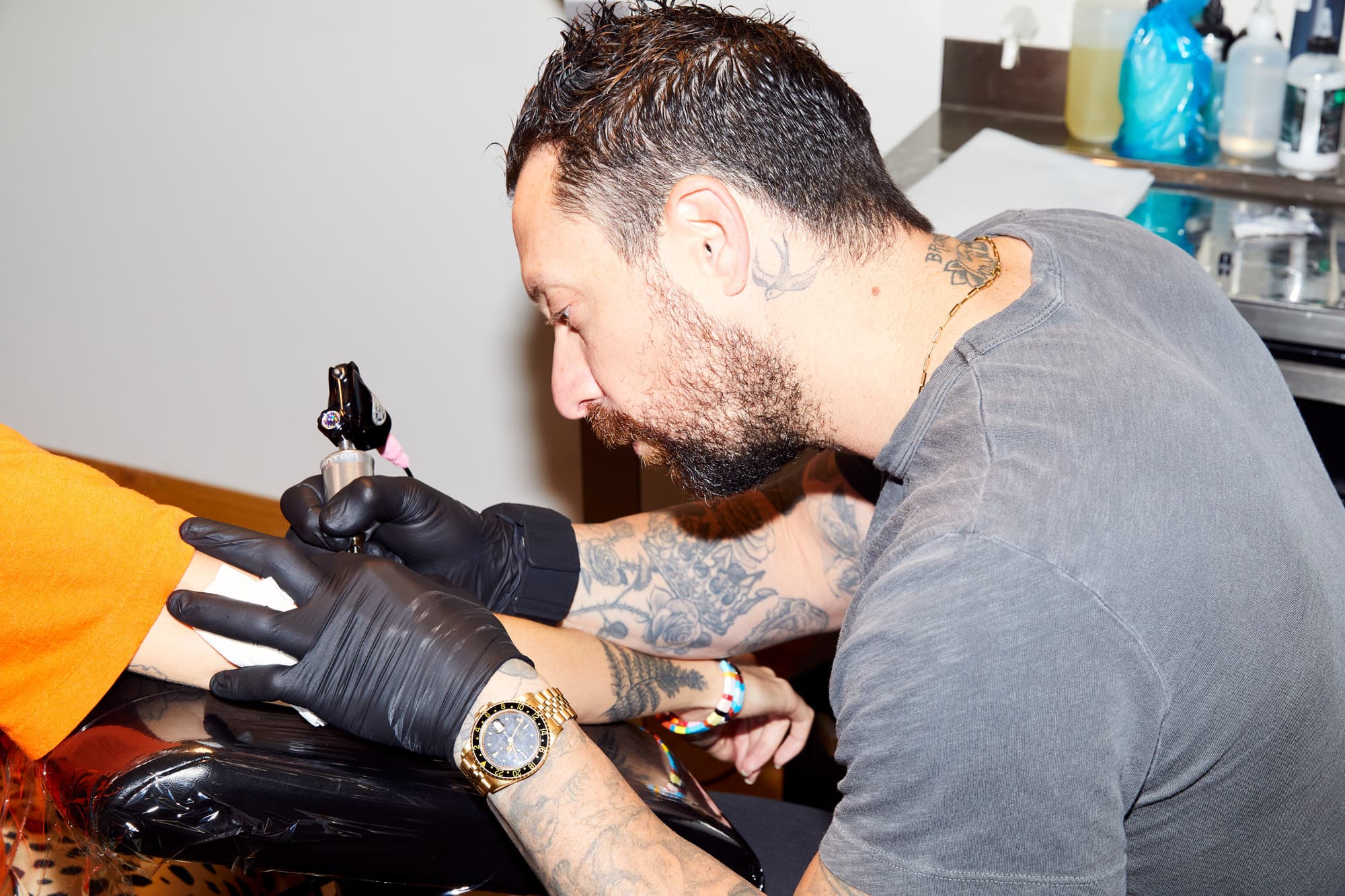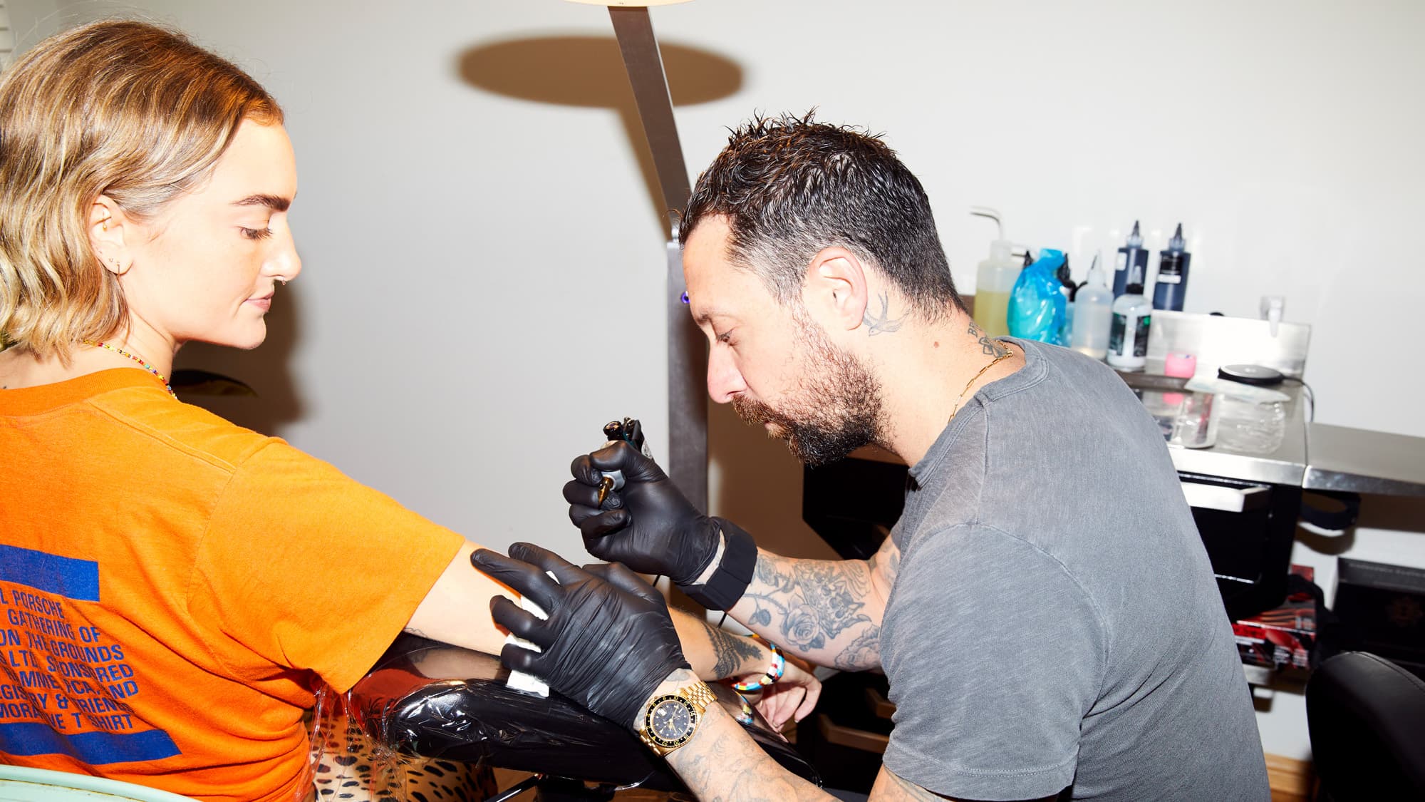 . “Traditional tattooing is very important in the tattoo world,” he says, moving the needle down my elbow with laser-like focus. “The bold line is where it all started. Now it’s evolving. You can do so many more ideas with fine line, because it opens the door to designs that you never thought you could put on the skin, like the finest script that your mom or dad wrote you. You can transfer the exact line weight [so] that it doesn’t have to be a thick line.” He motions down to my nearly finished tattoo. “Stuff like this—the microscopic portraits. You can’t do that with a thicker needle. It just doesn’t look the same. It becomes more cartoony, whereas this is very realistic.”