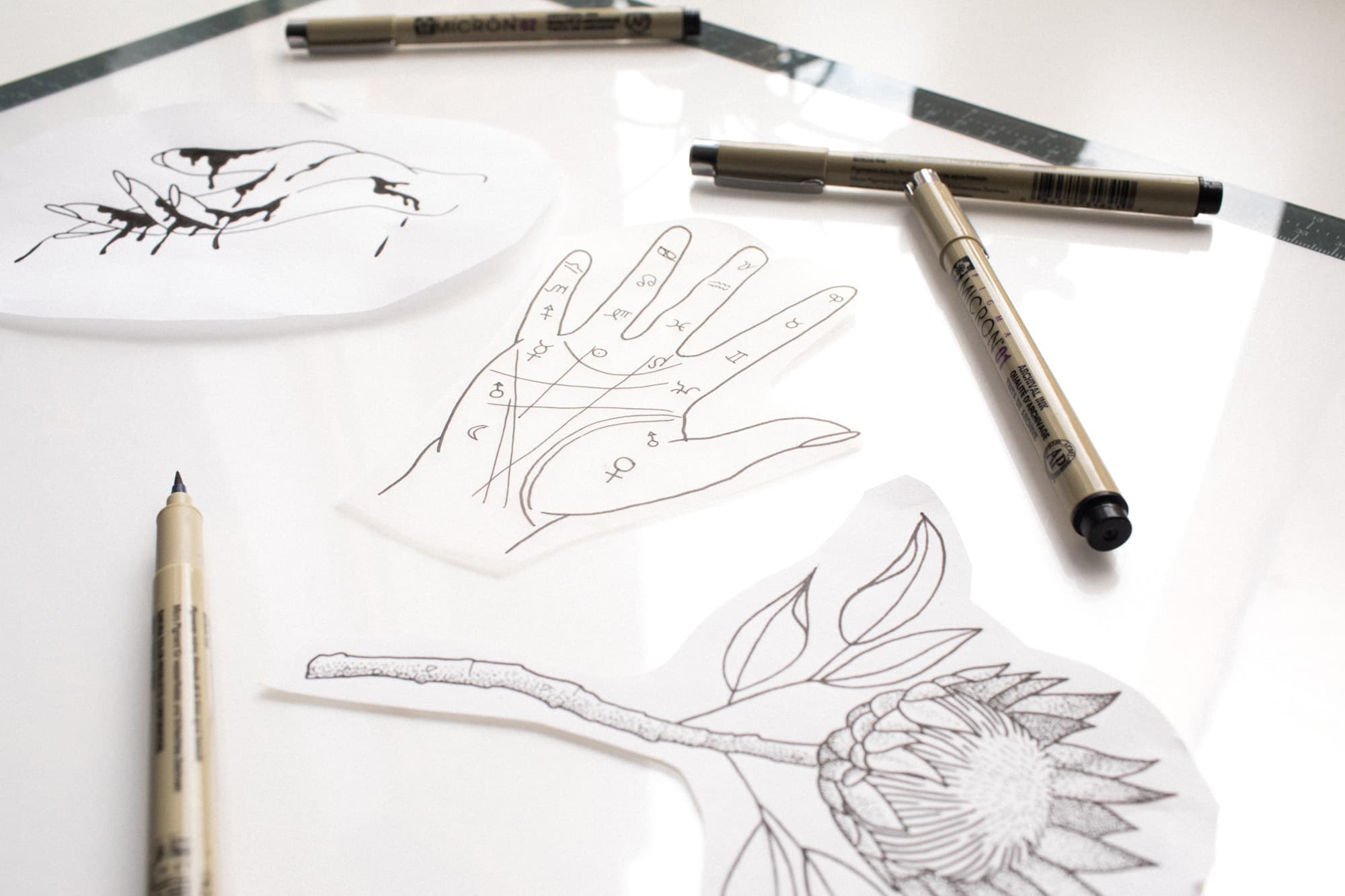 It’s no accident that the most striking part of the space is the veritable lack of noise, rare in the world of tattooing (remember those buzzing machines?). Tea and her fellow artists all tattoo in the hand-poke style, meaning their tools are limited simply to needles and ink. “It’s the oldest form of tattooing known to man. It [existed] before electricity was even invented. They are constantly finding mummy sarcophagi that have tattoos on them.” Although many tattooers pursue an apprenticeship in a traditional shop, Tea was determined to create her own path. “I think what drew me into it was that it’s a really intimate experience. I was tattooing my friends, and I just started pursuing it because it was gentler and more approachable than going to get an apprenticeship.”