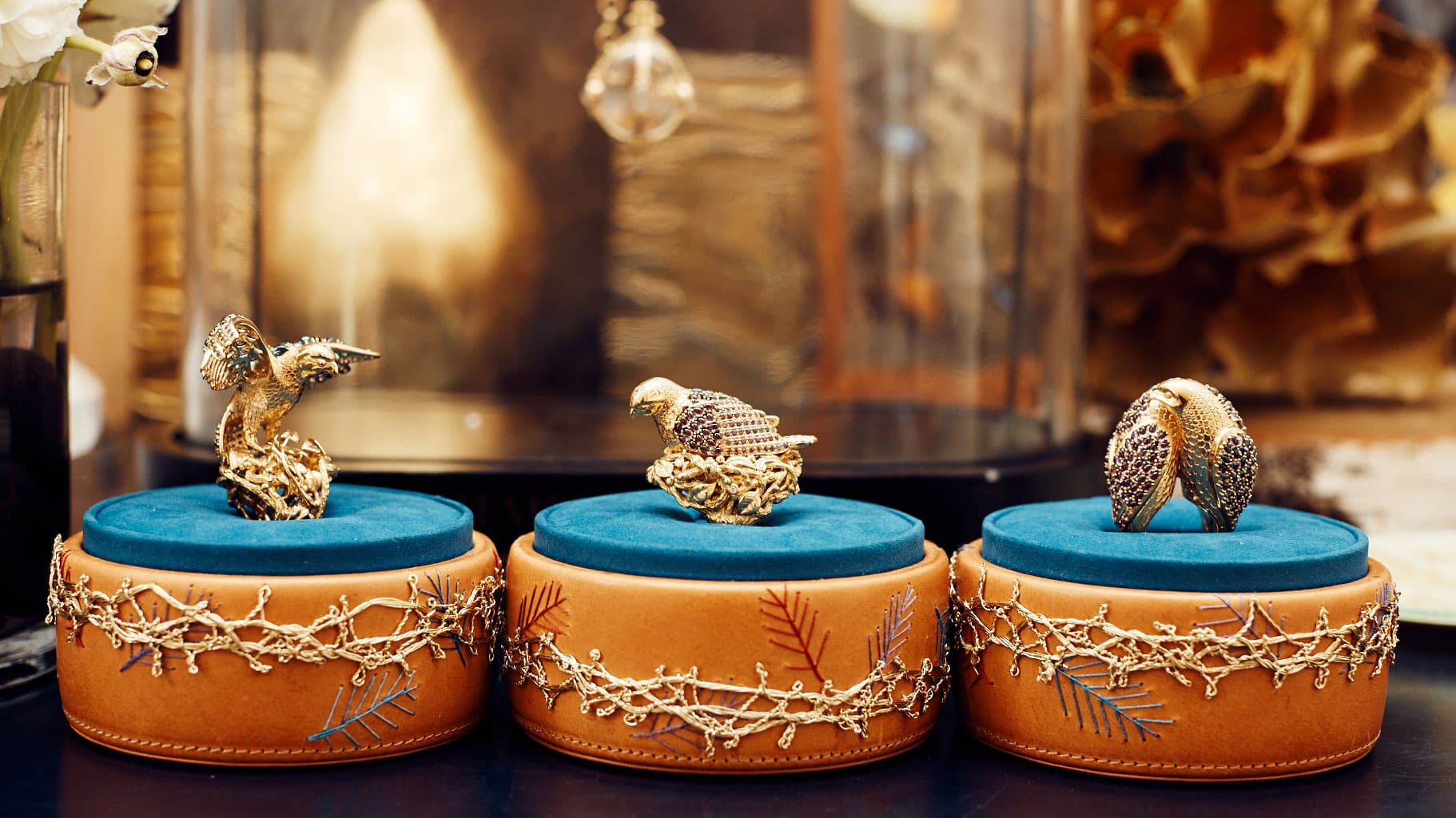Now, Temple’s work is divided between her main collection and her haute couture collection (“Haute Couture for me means taking complete creative liberty and expressing something that I love and what I want to do”), which takes the form of lifelike animals, both real and imagined—all housed in precious boxes (the falcons live in hand-embroidered leather boxes embroidered by an expert in Renaissance lace). These pieces are called the “Golden Menagerie.”