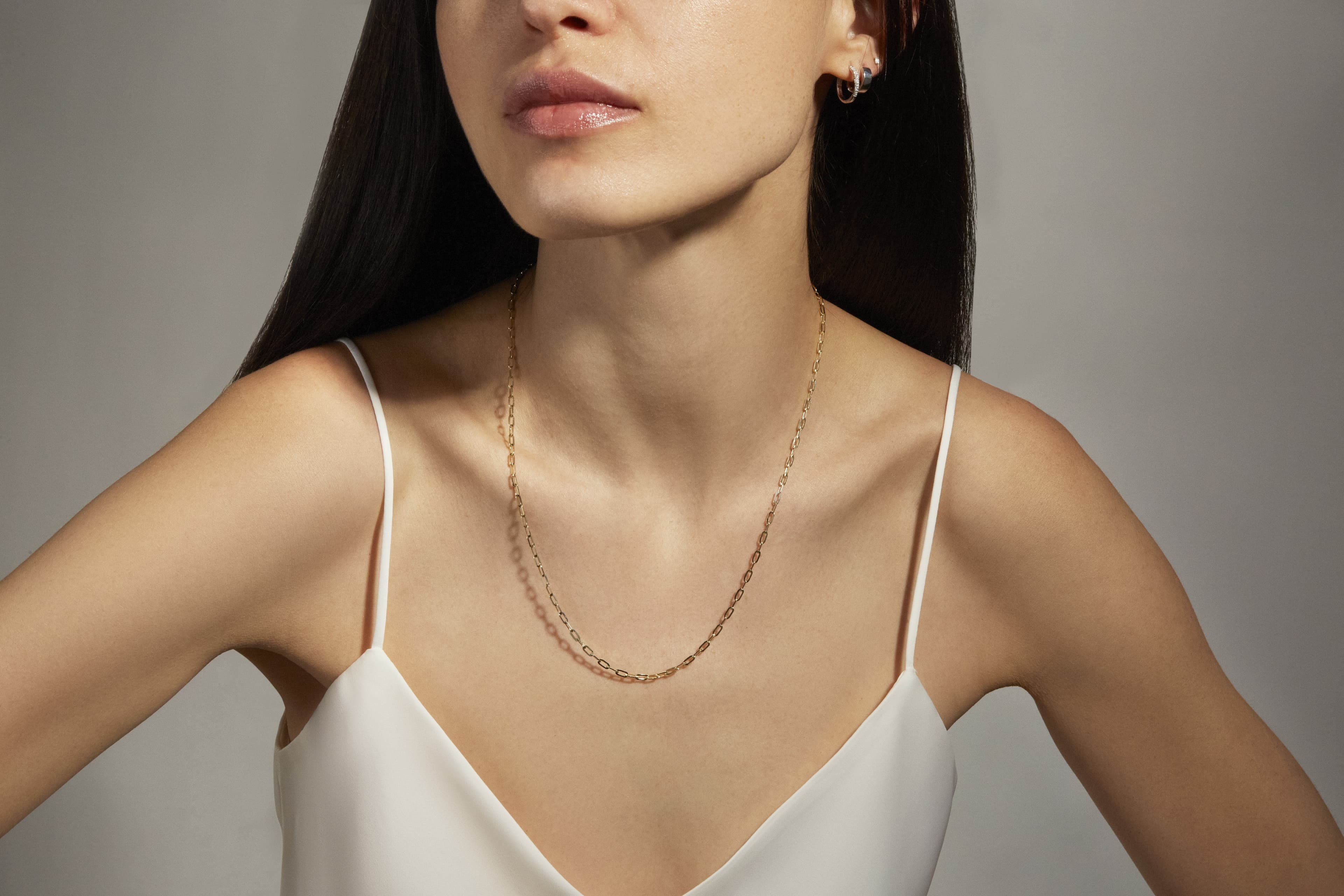 NK: “Yes, we definitely would. We offer both lab-grown and natural diamonds, so it’s something that we’re open to. We don’t sell many different types of tennis necklaces, and we try to curate the best assortment of jewelry through our brand and designs. We’d rather offer two or three of the best types of tennis necklaces than a wide range, so we tried to think about if you were to buy just one tennis necklace as our customer—a working woman looking to indulge and splurge on a piece of jewelry for herself that will last forever—what would that look like? We thought very carefully about the carat weight, the type of diamonds, and the color of gold, and that’s how we came up with this necklace. I think lab-grown is a nice alternative, and our customers definitely wear both, but for us right now, we still see the value in natural diamonds when you’re investing in a forever piece, so that felt like the right first step if you were just to buy one necklace.”