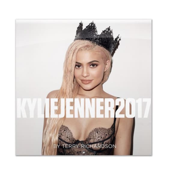 She shared the The Kylie Jenner 2017 Calendar cover, in which she’s wearing a black lace bra and a black crown atop a cascade of long, distressed blondish/pink hair, with her millions of followers on Instagram and Snapchat: