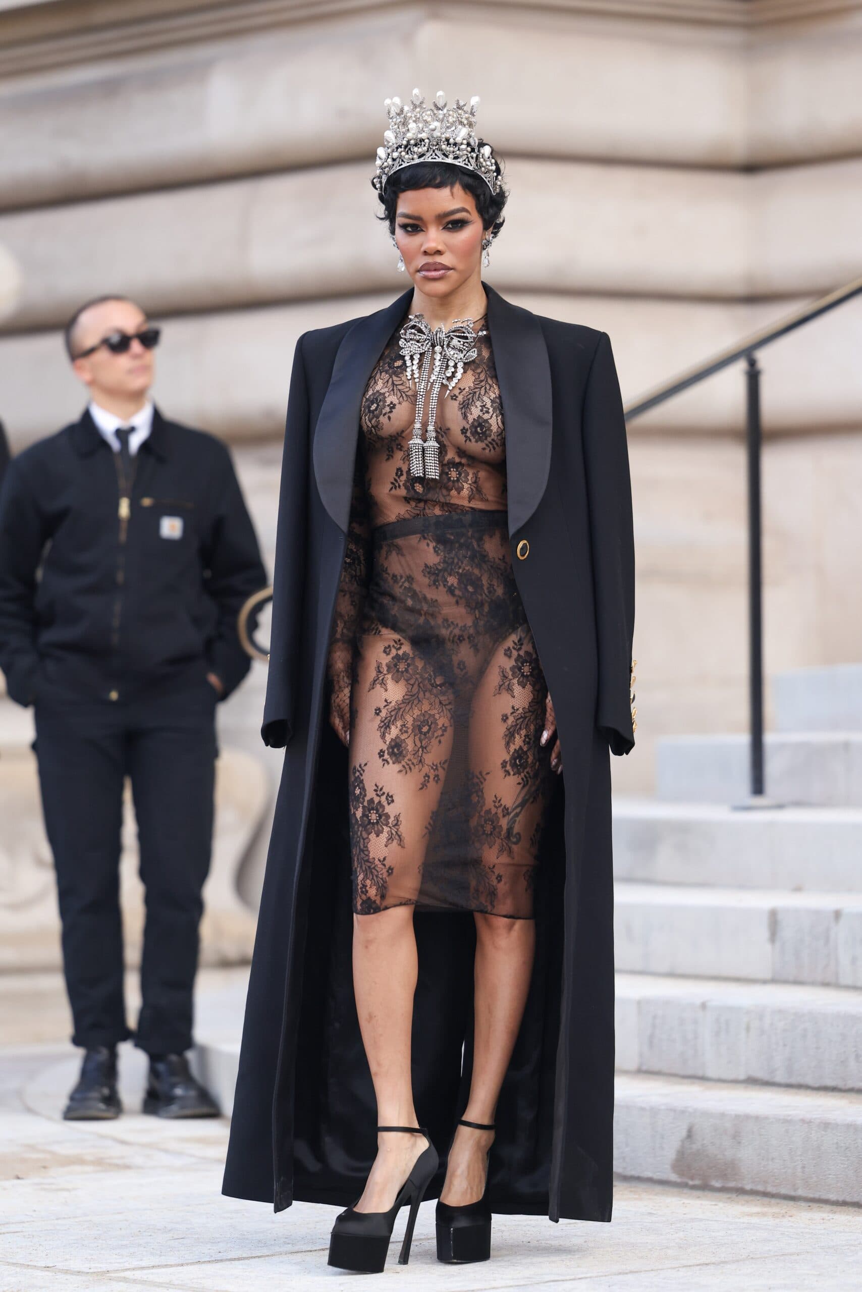 SplashNews.com/ShutterstockFor the Schiaparelli show, Taylor opted for a lace knee-length dress—a completely sheer one, I might add. Overtop, she had a structured black coat slung over her shoulders. And, the regal touches for the queen herself? Two Schiaparelli crowns inspired by those infamously snatched from the Louvre in 2025 and a bow attached to the front of the dress encrusted with rhinestones.