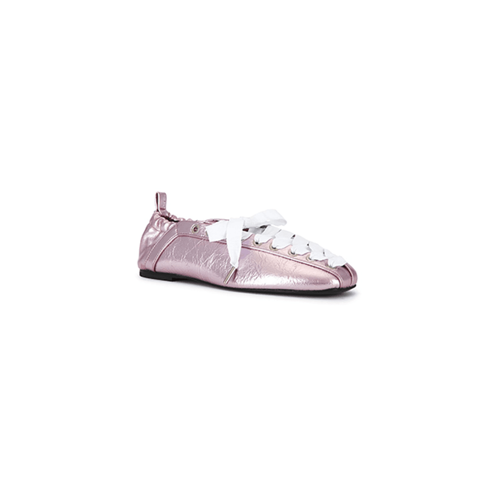 GANNI's take on the ballet sneaker is made extra sweet by this metallic pink color-way—as well as by the eyelet lace-up front reminiscent of corsetry and the timeless square toe.