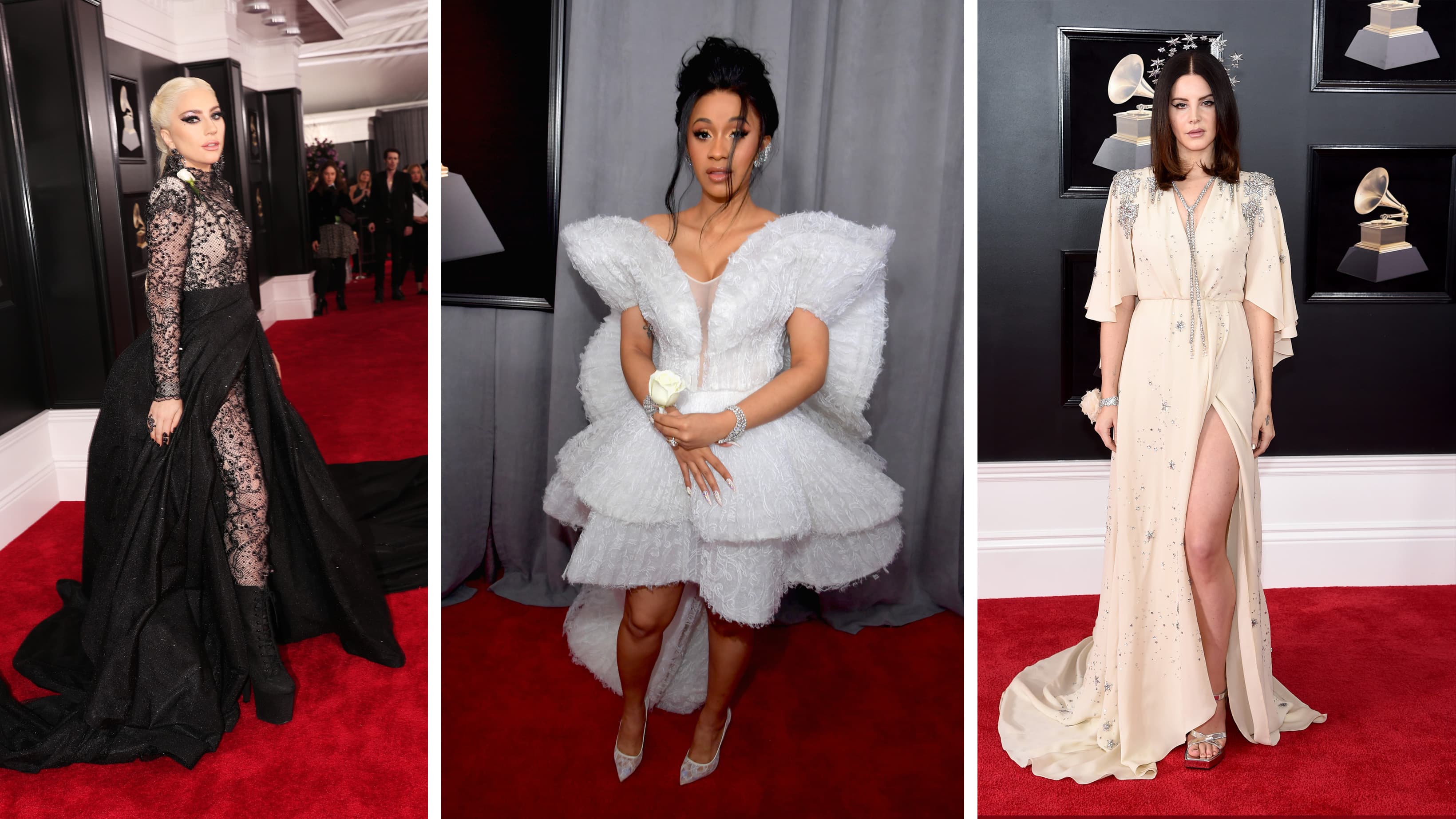 For the first time in 15 years the Grammys are being hosted in New York City and we couldn’t be more excited—mostly because we feel like we’re part of the action even though we aren’t *actually*. But no matter! We’re still kicking back and admiring the red carpet from afar, especially since the dramatic award season outfits are back in full force. Every celebrity will be wearing a white rose in support with the Time’s Up Movement but aside from that, everyone’s individuality is showing—in the form of gowns that take up an entire room and floral suit jackets. From star crowns that we would get married in (hi Lana del Rey!) to the most intricate ribbon-laced ponytail we’ve ever seen (hey Lady Gaga) to a very bedazzled blazer (Elton Johh!) here are the best looks from the biggest night in music.