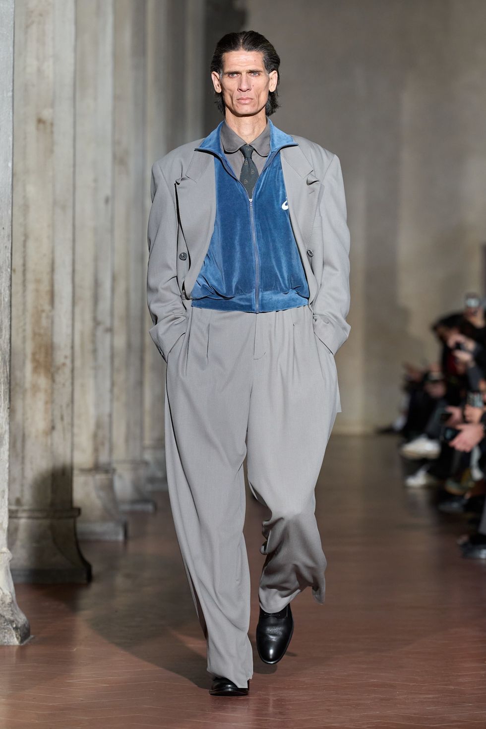 Block colors were layered at Auralee, where a translucent butter yellow georgette button down was paired with a baby blue tie, and a baby blue button down was layered with a black tie and red pullover. Over at Soshiotsuki, a gray suit was intercepted with a blue velour quarter zip, which revealed a shirt and tie combo in almost the same gray as the suit.