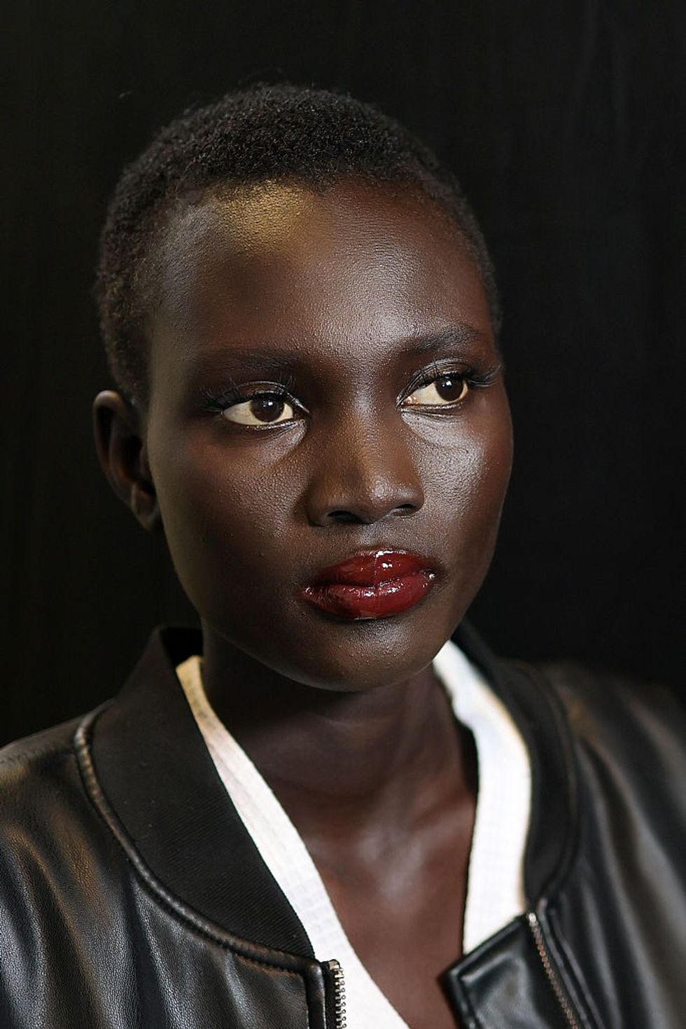 To start, she created a base of "healthy, glowing skin" using the brand's new Architecture Radiance Hydrating Foundation SPF 50--a light-reflective foundation that editors have been practically fighting to get samples of. Then, it was time for the lips to shine. The shades mirrored the collection itself: warm browns, deep chocolates, and flashes of neon pinks and peaches. “The neon really brings it into Haider Ackermann for Tom Ford’s world,” Bridge says. The bright cherry-red shade was a standout, which she achieved using a four-step process: blending a base of Tom Ford Runway Lip Color in 18 Unzip and Lip Color Matte in 08 Velvet Cherry, adding a swipe of Slim Lip Color Shine in 16 Scarlet Rouge to add dimension, then Tom Ford Gloss Luxe in 01 Disclosure for the glass-like vinyl effect.
