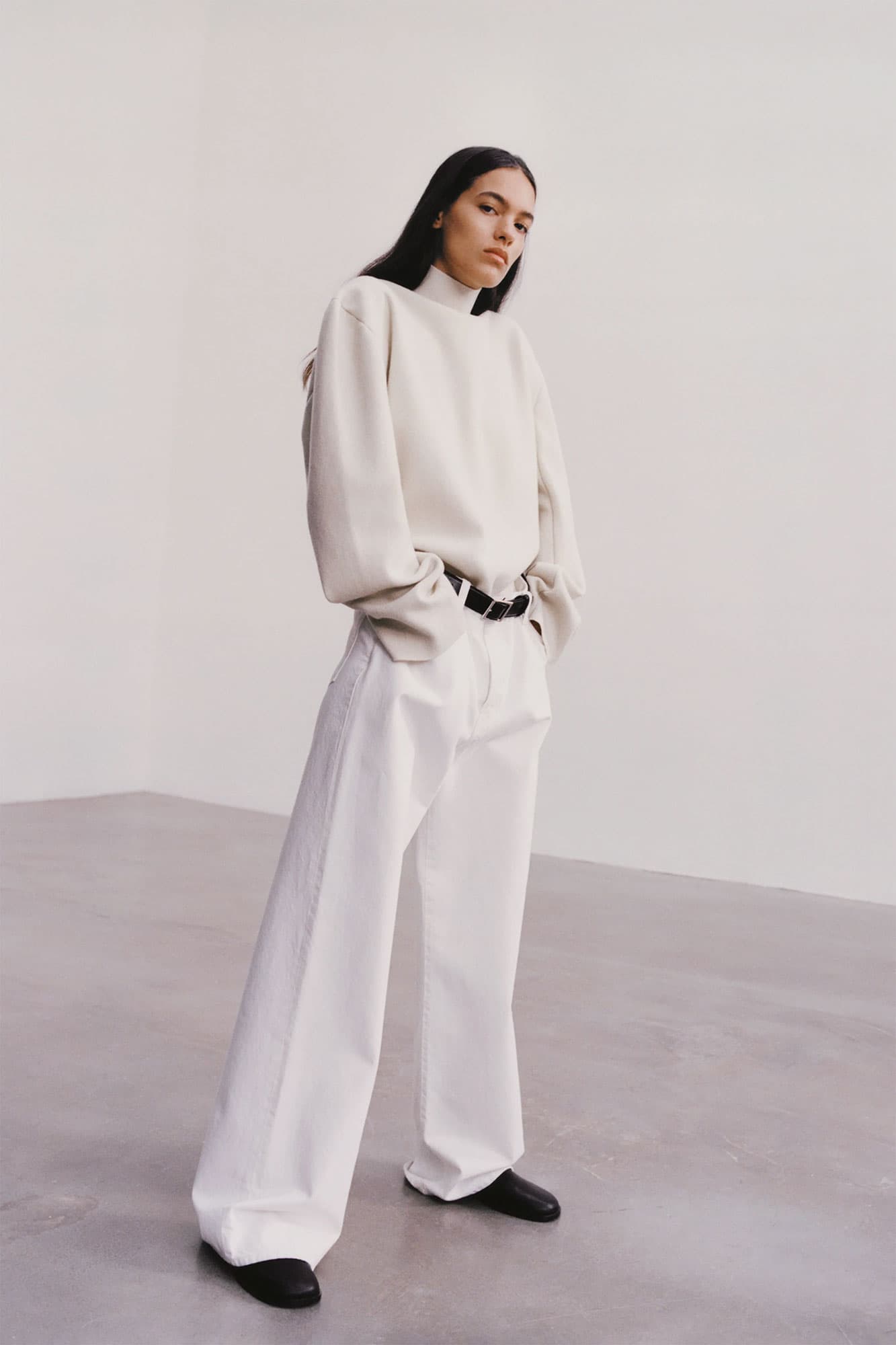 If anyone is a proponent of tonal dressing, it’s the infamous twin duo behind The Row. Each season Mary-Kate and Ashley remind us why we love the formula, and this fall was no different. The oversize white ensemble is effortlessly cool, and we love their use of a solid accessory like this black belt to break up the monotony of the look.