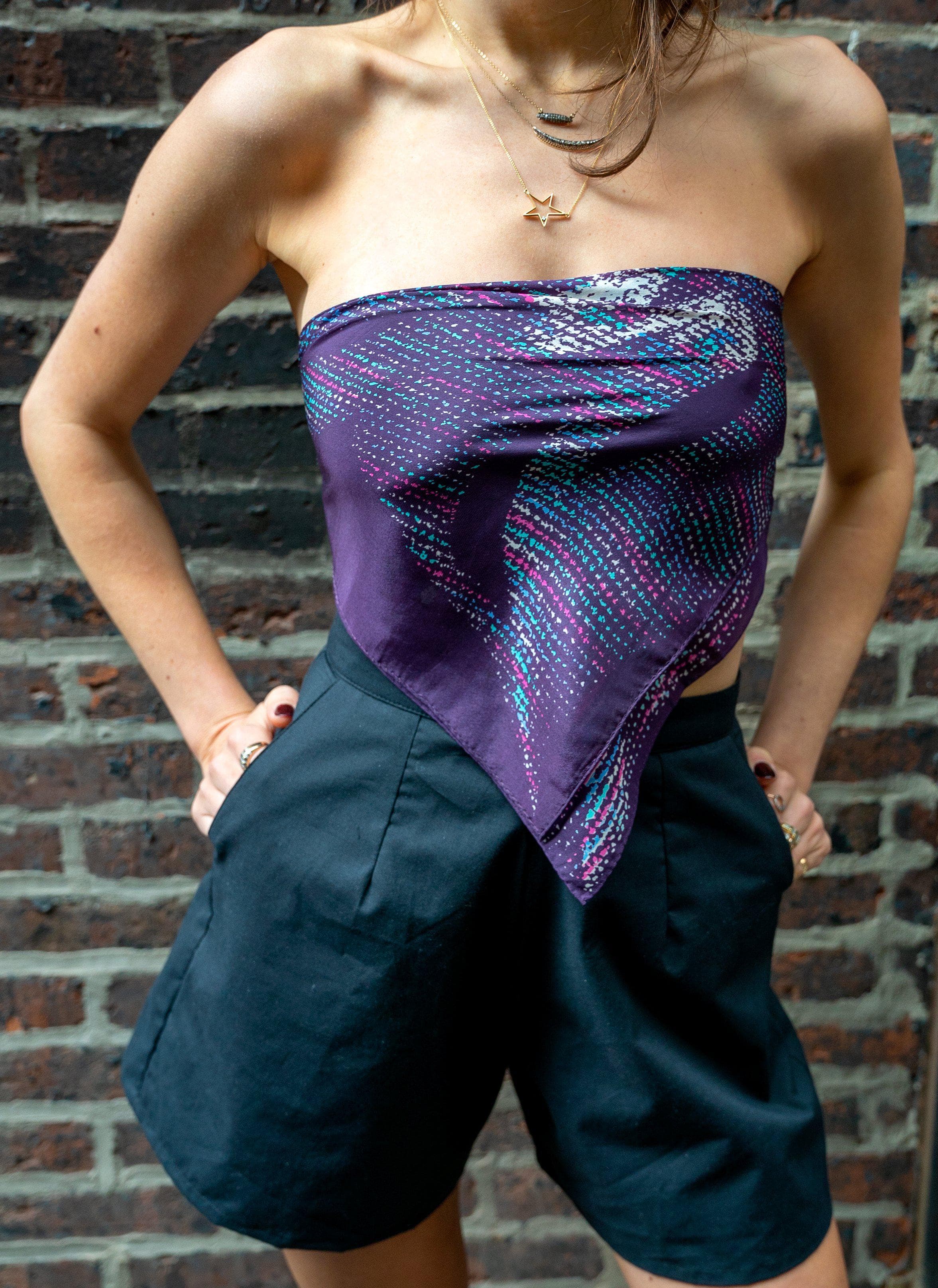 Outside the streets of NYC, pedestrians may not be as brazen, but other riffs on the traditional idea of shirting have emerged. The scarf top is an idea that is still going strong after multiple seasons of enjoying mega trend status. Fashion resale platform Depop saw a 76 percent spike in sales of scarf tops between June and July. We've also witnessed the vest trend evolve into its own shirting options as summer eliminates the need for under layers. Corsets and swimwear tops are other options to be worn in lieu of blouses, button-downs, and t-shirts.