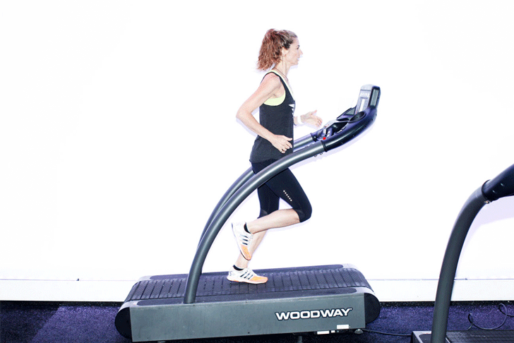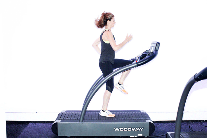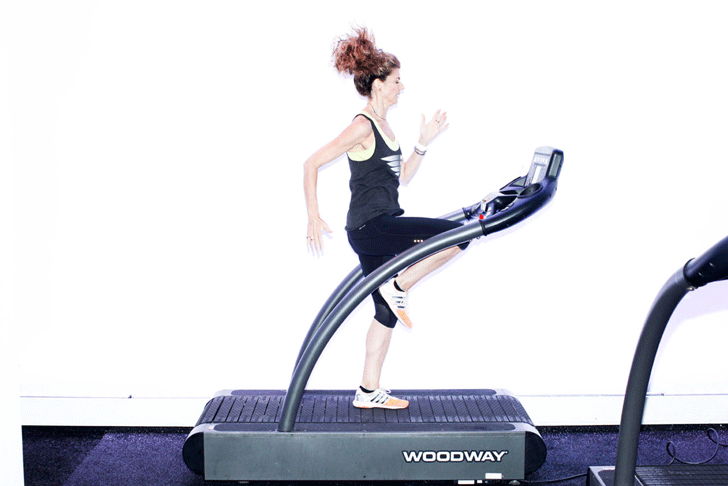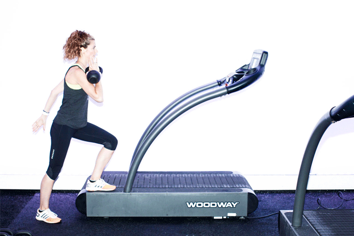 “Have your kettlebell is in a rack position in one hand. Place the opposite foot on the treadmill and drive the opposite knee up to parallel. This movement works the stabilizers around the ankles, as well as the quads, glutes, and core.”