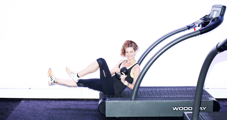 “Hold the kettlebell with the bottom facing up (or by the horns). Lightly tap the bum down to the back of the treadmill while pressing the kettlebell overhead as you stand and push the hips forward, engaging the glutes. It’s great for shoulders and lower body.”