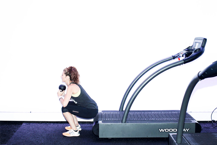 SQUAT TAPS WITH OVERHEAD KB PRESS   "Hold the kettlebell with the bottom facing up (or by the horns). Lightly tap the bum down to the back of the treadmill while pressing the kettlebell overhead as you stand and push the hips forward, engaging the glutes. It's great for shoulders and lower body."