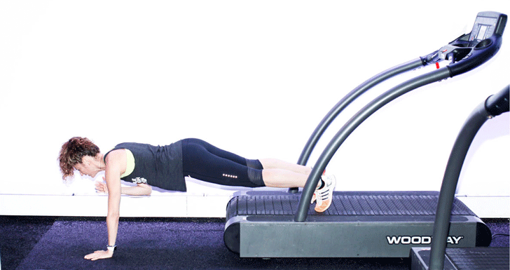 STRAIGHT ARM PLANK WITH SHOULDER TAPS   "Go into a straight arm plank position off the back of the treadmill with shoulders directly over the wrists. Engage the abdominals and tap fingertips to the opposite shoulder, alternating sides. Lock the hips in place to maximize core strength benefit. (Hold for 60 seconds)"