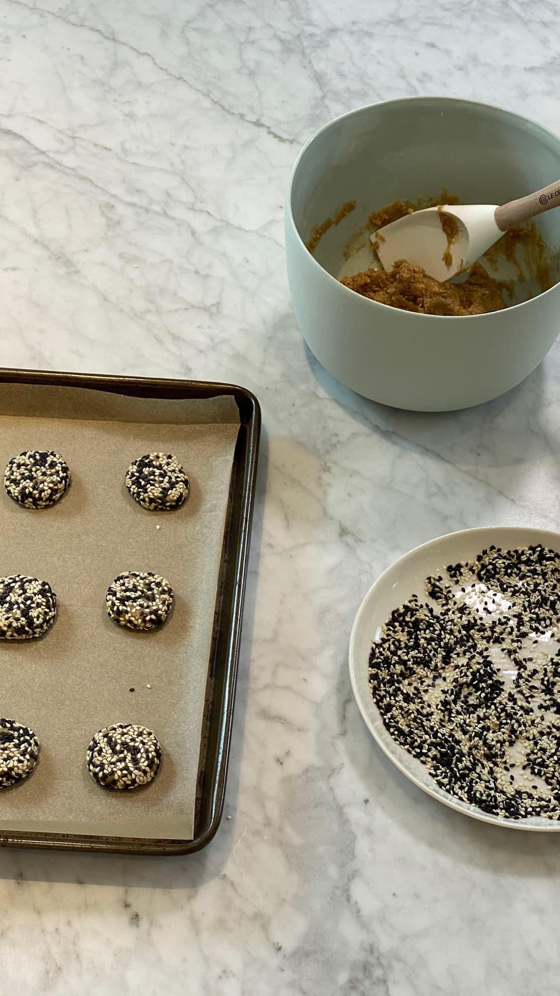 4. Use a tablespoon to scoop the cookie dough out into a ball, and roll it in the sesame seeds. Place each one onto a baking sheet lined with parchment paper, and gently compress to flatten out until they’re about